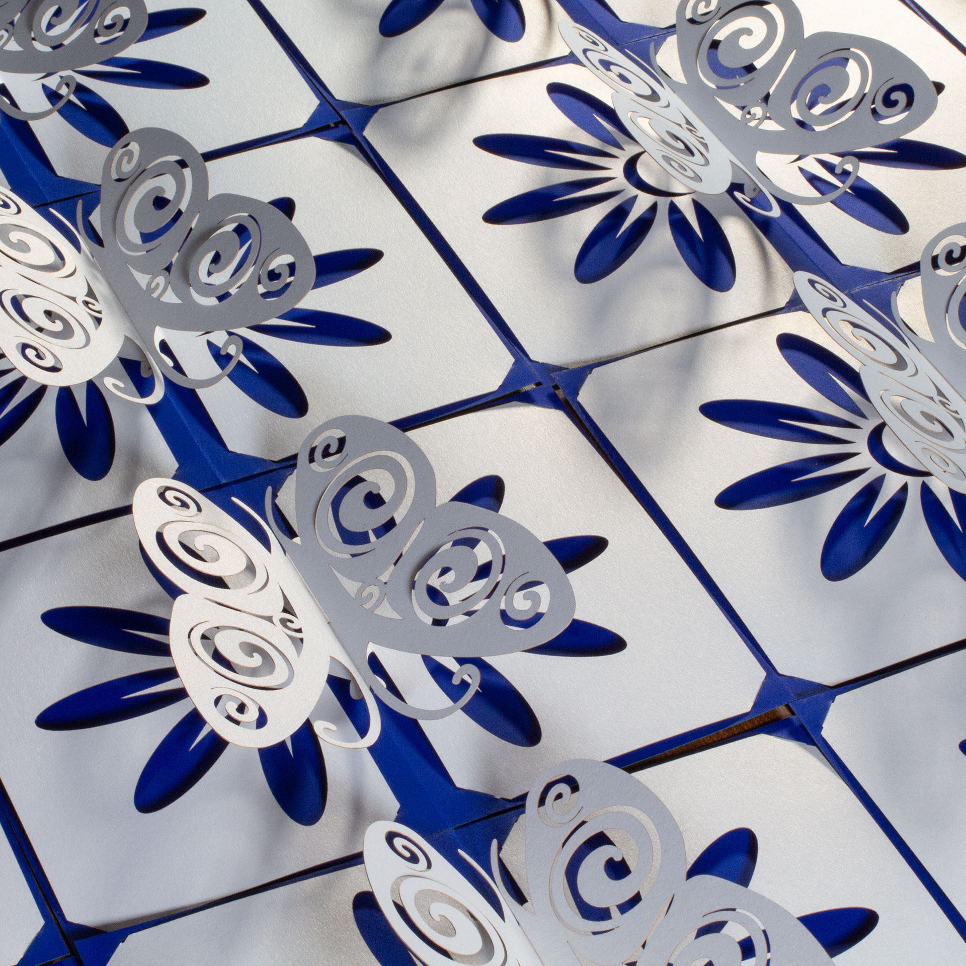 I made these pop up origamic architecture/kirigami butterflies for the 2024-2025 holiday season. The butterflies are two pieces, laser-cut from the last of the Ice Gold stock (now discontinued). Alas the wonderful Curious Skin cobalt blue stock I used for the backing cards is also no longer available. I liked being able to accentuate the contrast between the blue and white with the extra cutouts, the flower on the inside and the spiral on the outside.
