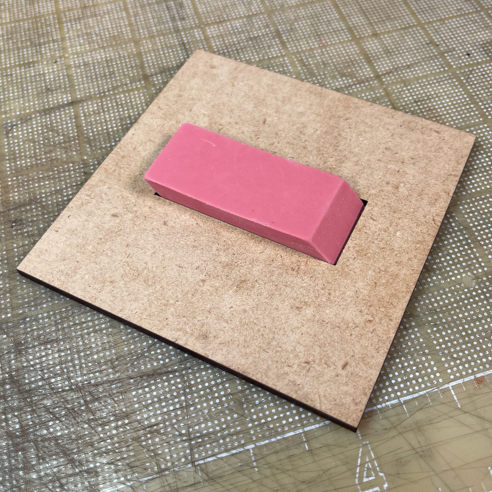 I envisioned something that would echo the glass of the pen and ink bottles as well as the curves. The green glass acrylic seemed ideal for this, as it is a ringer for actual glass visually.