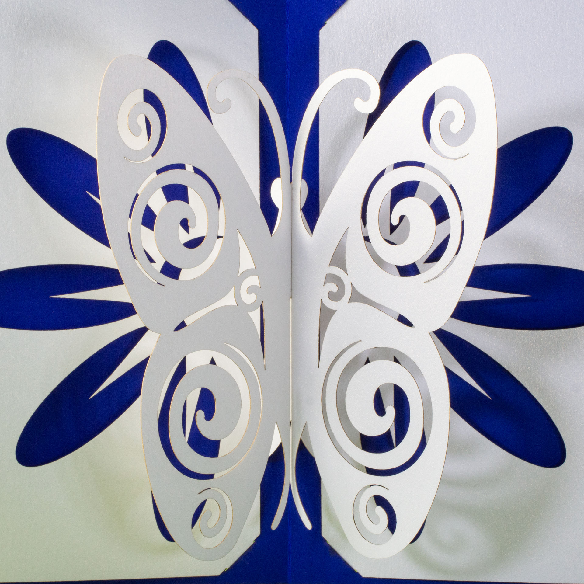 I made these pop up origamic architecture/kirigami butterflies for the 2024-2025 holiday season. The butterflies are two pieces, laser-cut from the last of the Ice Gold stock (now discontinued). Alas the wonderful Curious Skin cobalt blue stock I used for the backing cards is also no longer available. I liked being able to accentuate the contrast between the blue and white with the extra cutouts, the flower on the inside and the spiral on the outside.