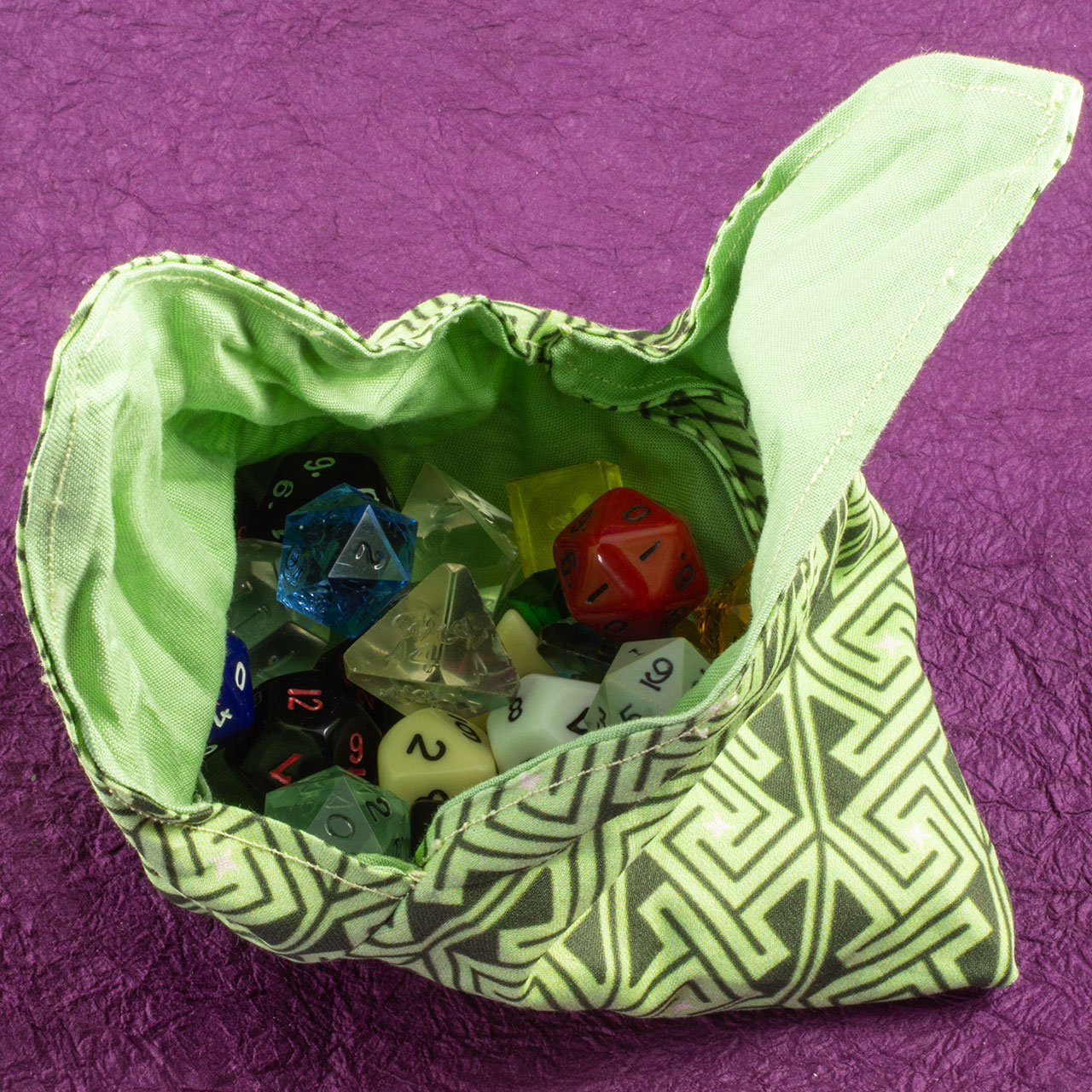 I thought a simple dice bag styled after a Japanese azuma bukuro bento/market bag would be fun. The fabric is 100% cotton sateen, custom-printed with one of my Celtic key pattern designs. I cut the fabric on the laser using the new vacuum tray, which was great for the precision.