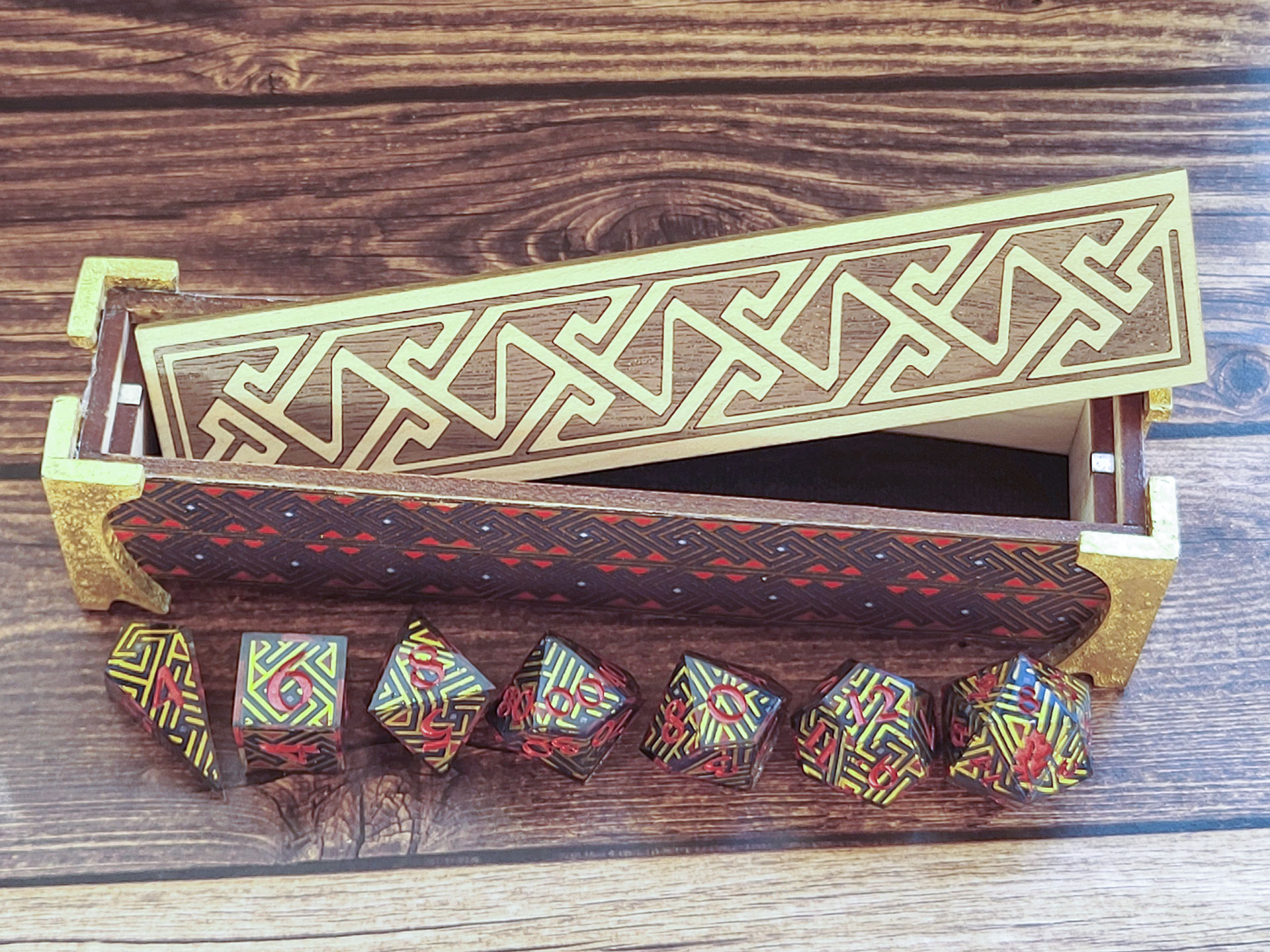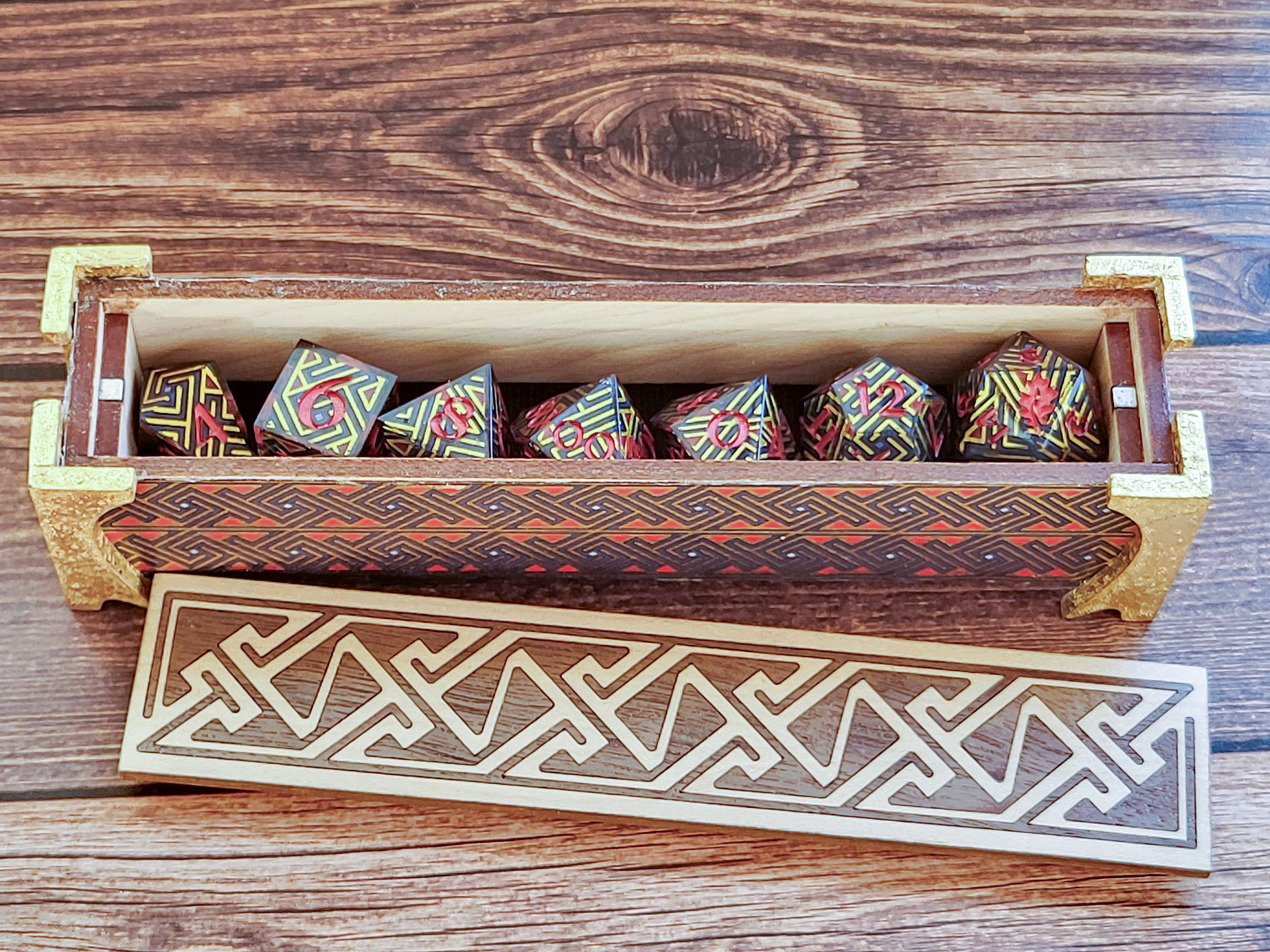 The finished dice vault, paired with the matching set of washi tape dice, is going to one of the winners of the big Silverleaf Dice giveaway. If you are seeing this the first week of July 2025 and you have an Instagram account, go enter for a chance to win that or a number of other wonderful handmade TTRPG dice and accessories.