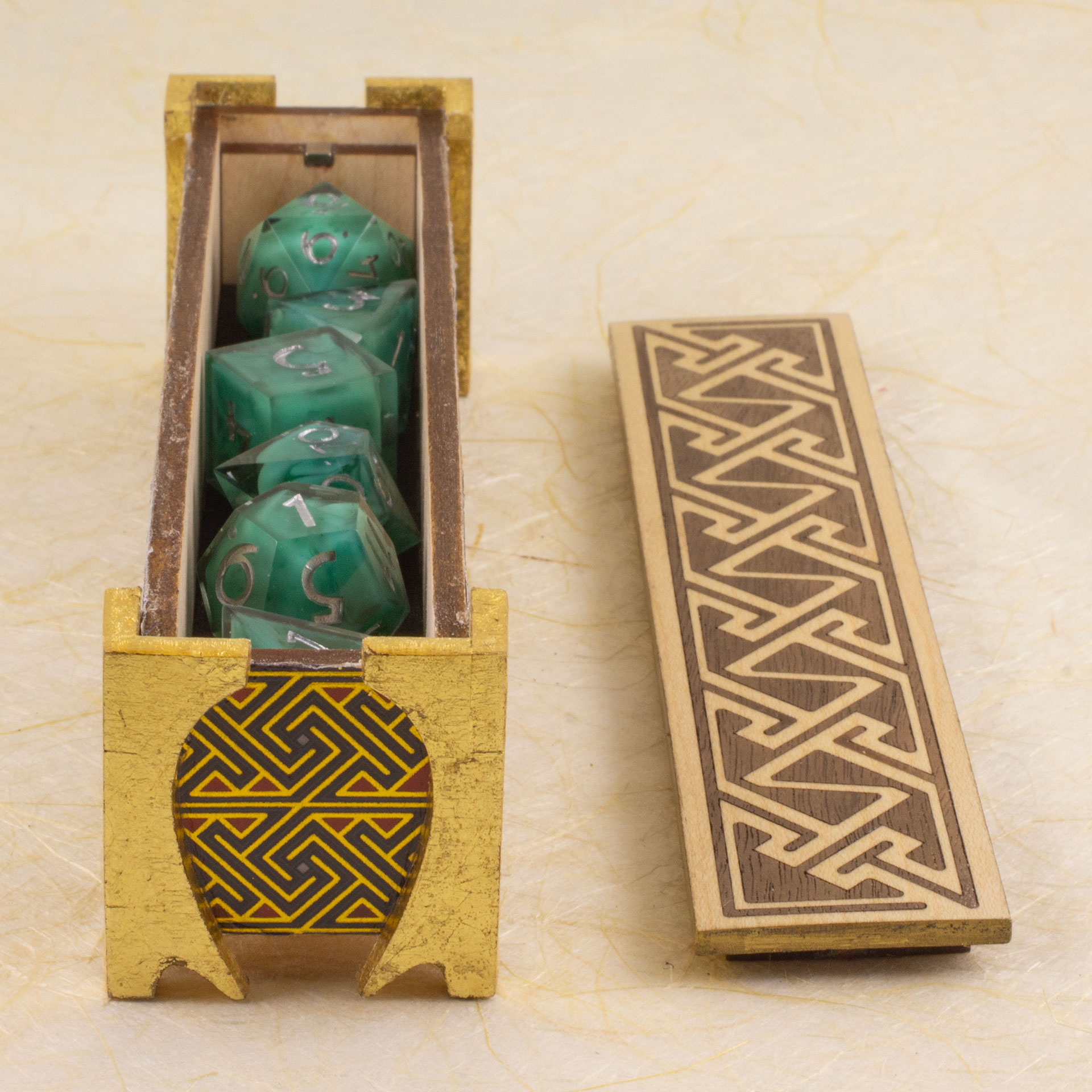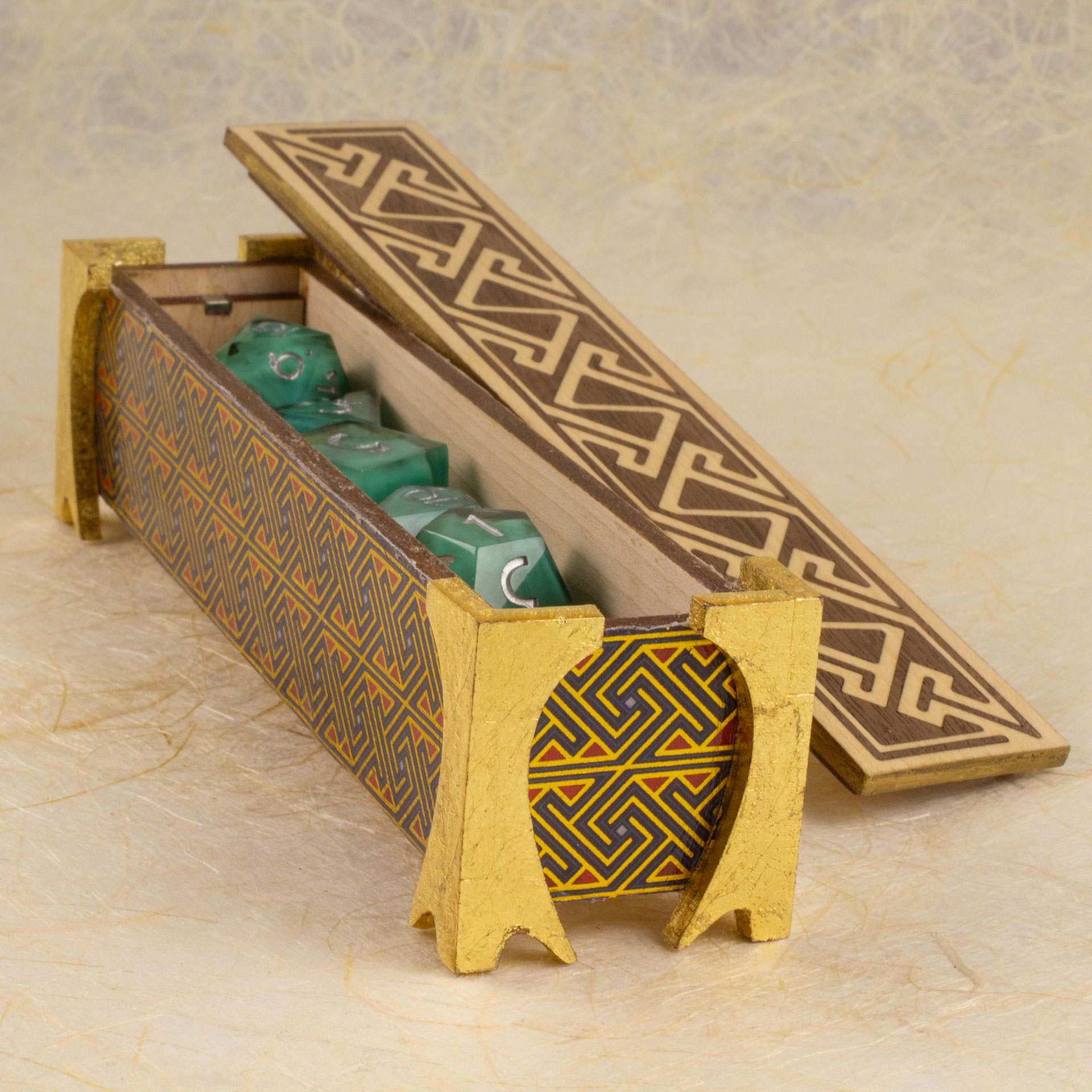I was thinking it would be fun to make a custom dice vault (a box sized to hold a set of dice) for those. I wondered about how I could echo the design elements of the washi tape on the vault. Watching a cosplay crafting video where someone was painting flex bond on EVA foam, I remembered that decoupage exists. After a couple quick tests, I determined that I could get the tape well adhered to wood with PVA wood glue and coat it with an appropriate sealer to get a nice finish.