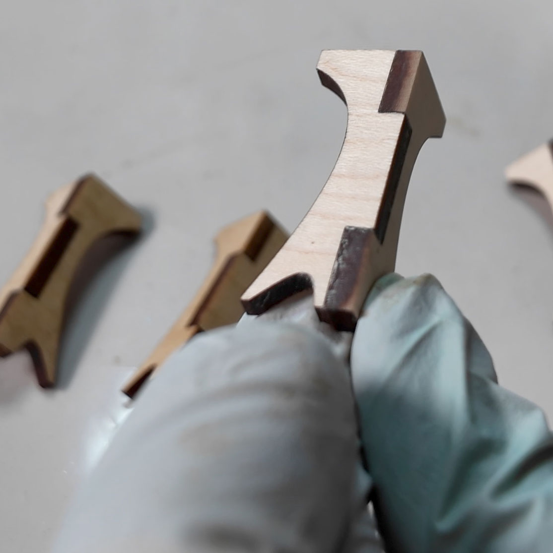 There were a few small revisions as I built it. The first version of the legs had one part of the foot coming to a point. As I got to where I was ready to glue them on to the box body, I discovered that a point on one foot had chipped off. That made me realize it was probably too fragile, and I redesigned to make it less pointy and have a larger point of contact for the surface upon which it sits.