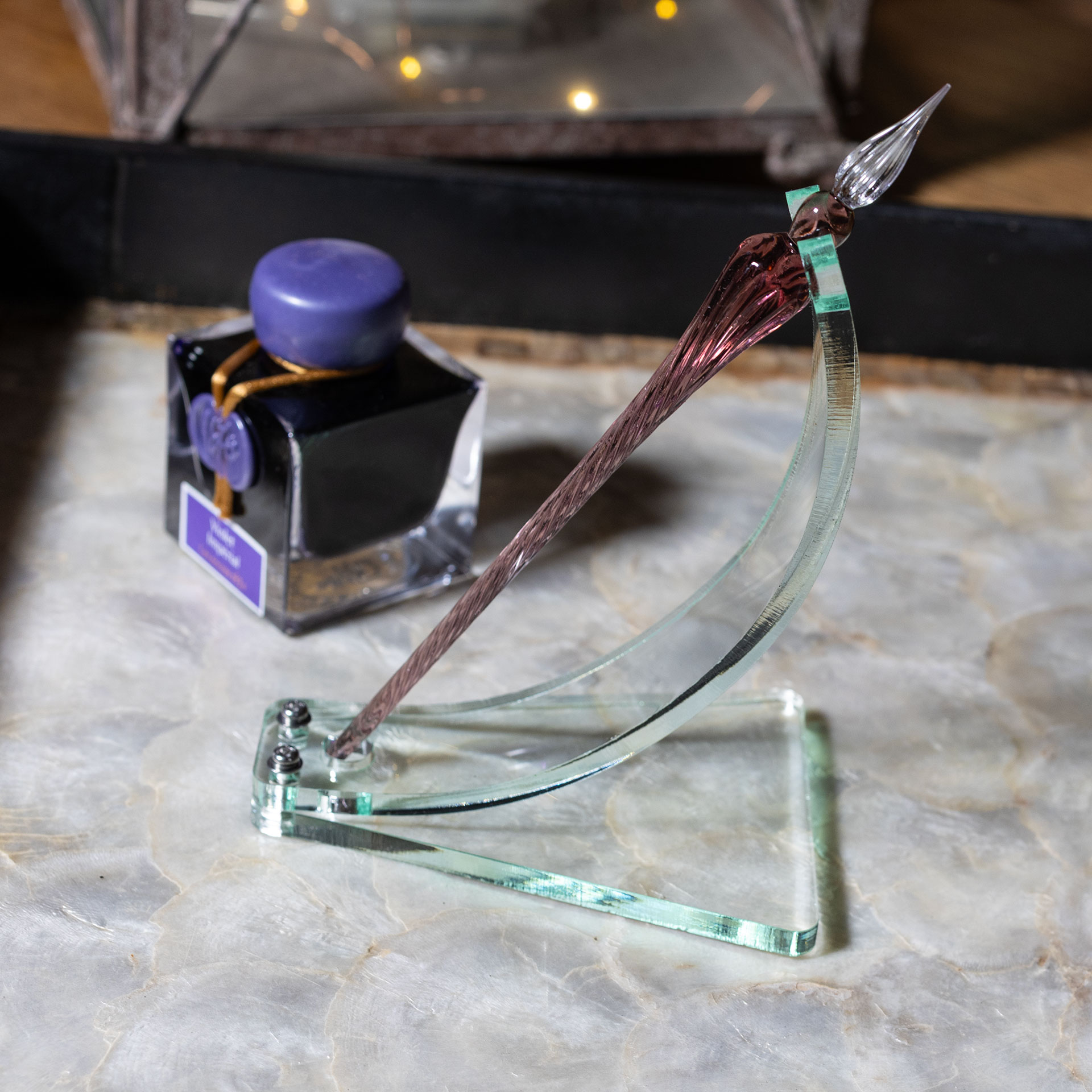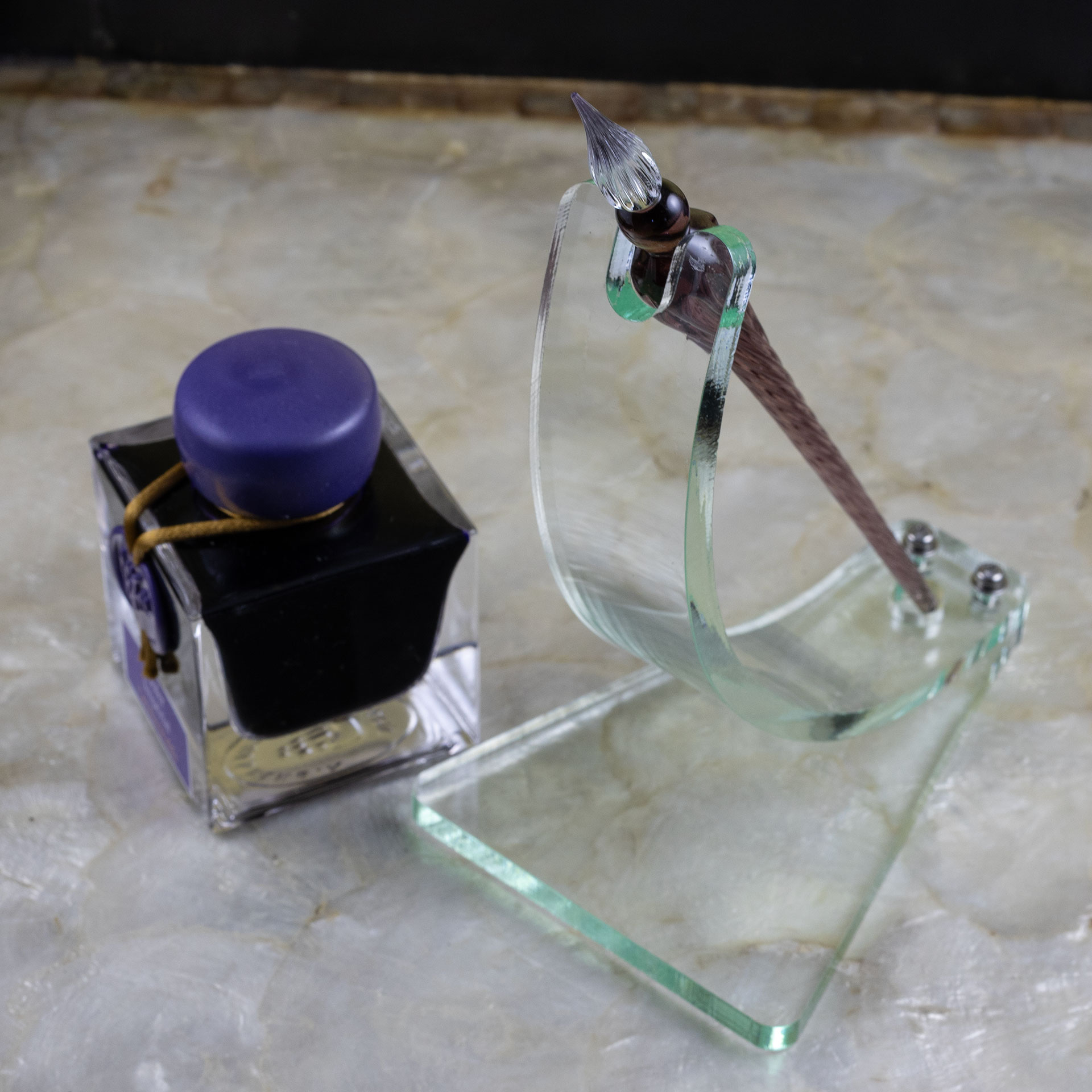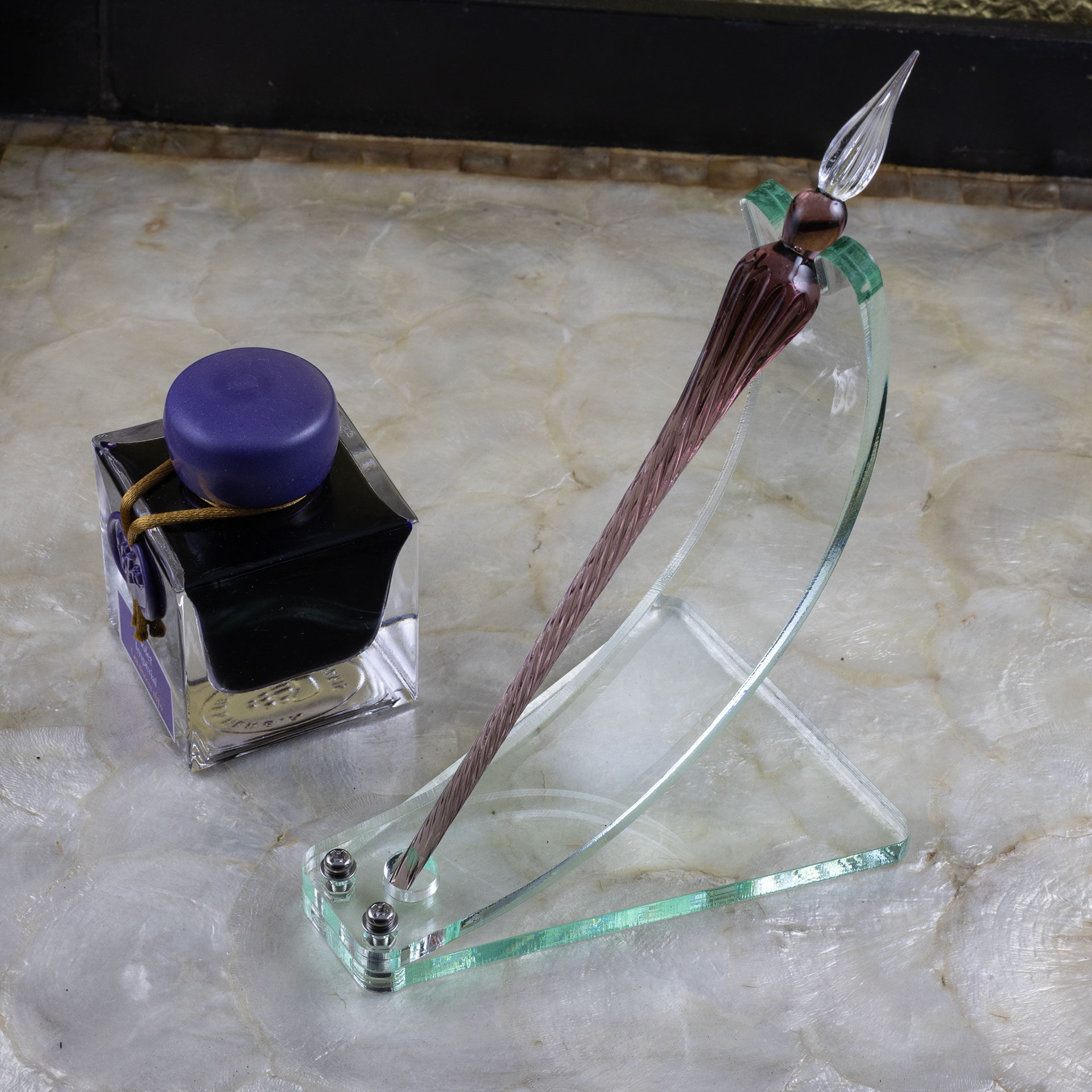 I envisioned something that would echo the glass of the pen and ink bottles as well as the curves. The green glass acrylic seemed ideal for this, as it is a ringer for actual glass visually.