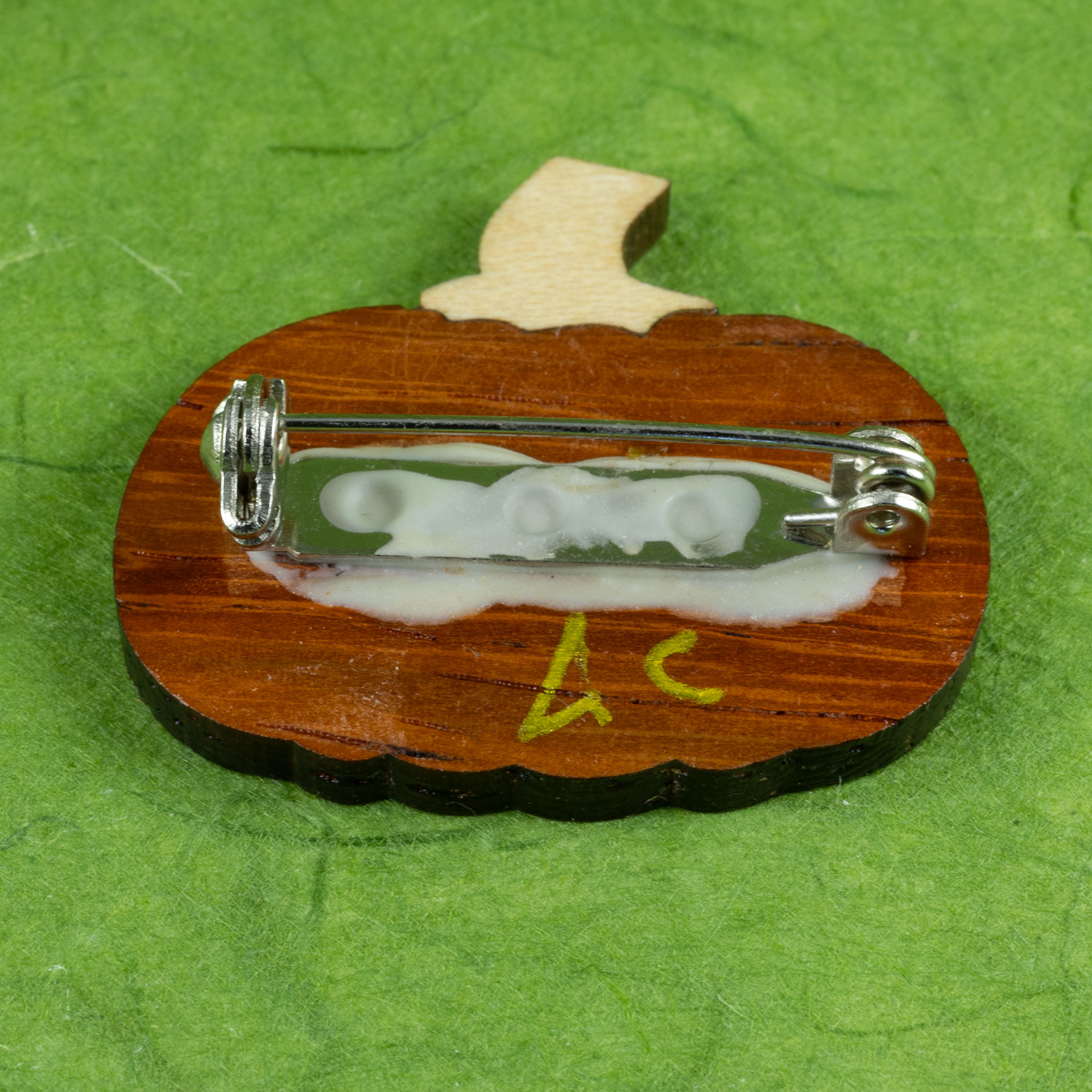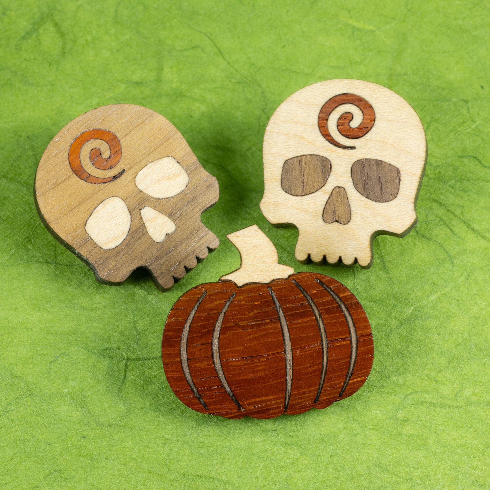 I have been wanting to try this technique for detailed wood inlay since seeing it demonstrated in a video Trotec posted last summer. I originally tried to make this pumpkin pin design last October with cut-through pieces like I have done for other wood inlay pins. The tiny walnut ribs just burned to charcoal, though. I thought of trying this new approach immediately, but had a lot of other stuff going on, and did not get to it until now.