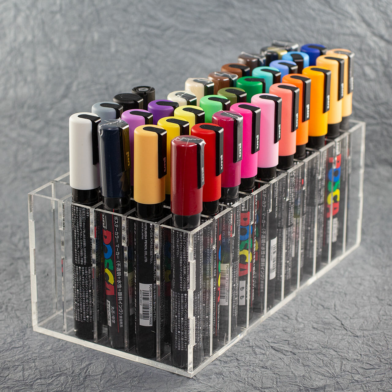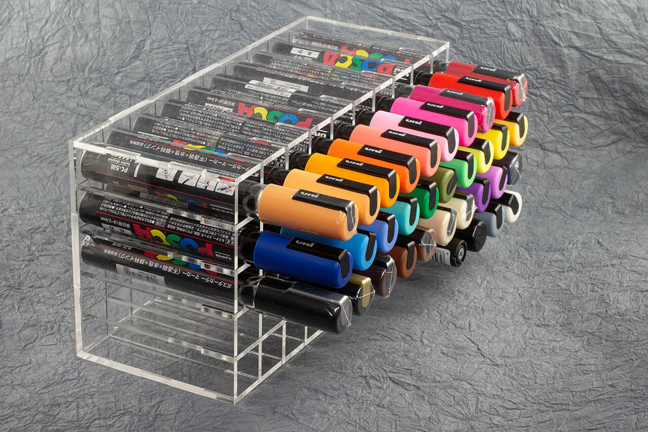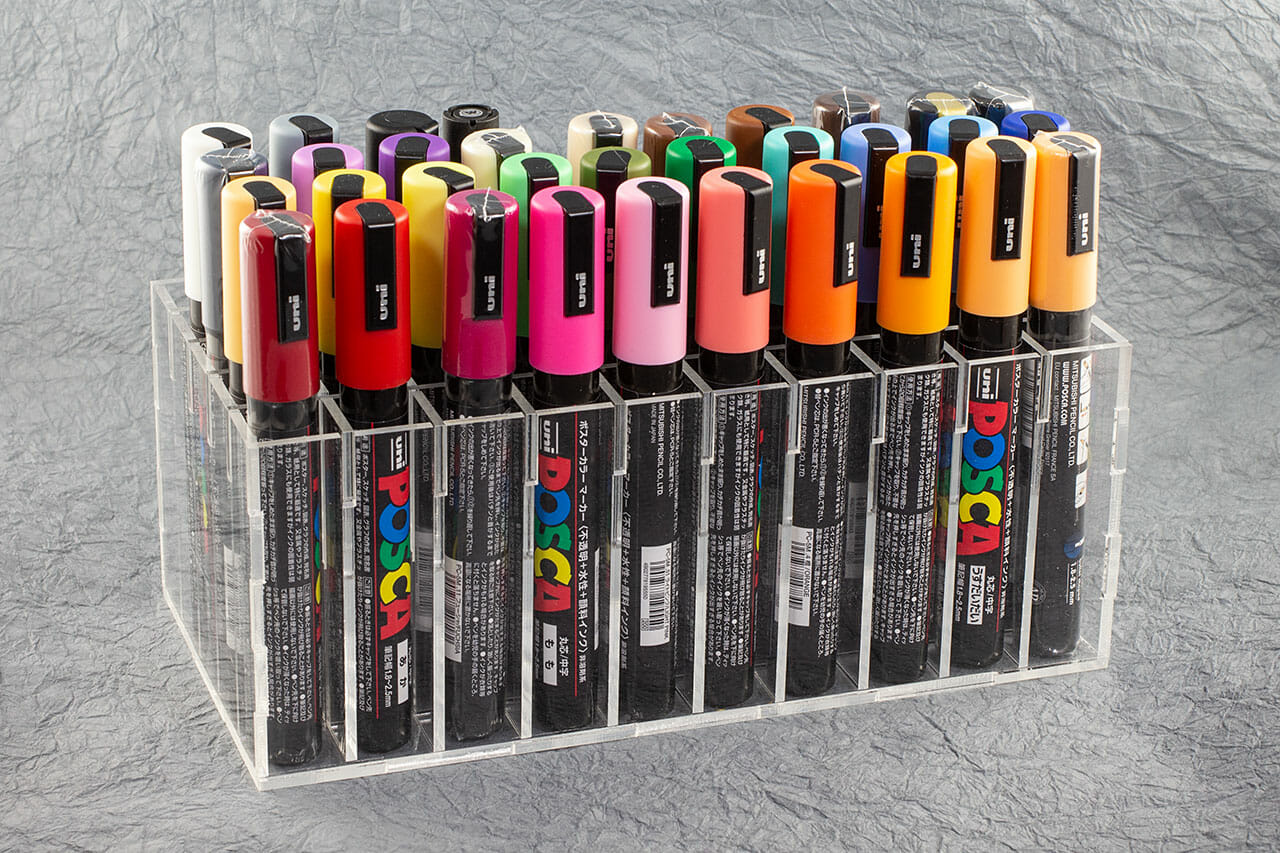 I picked up a set of Uni Posca paint pens while working on a project. They came in several boxes and, I quickly realized they would be a lot more pleasant to use if I had a way to keep them organized. There are a bunch of appropriate caddy designs floating around that use planes with aligned holes. While those use less acrylic, they seem kind of fiddly to insert and remove pens. In the interest of keeping friction while working to a minimum, I designed this divided box caddy. This works well both upright and on horizontally.