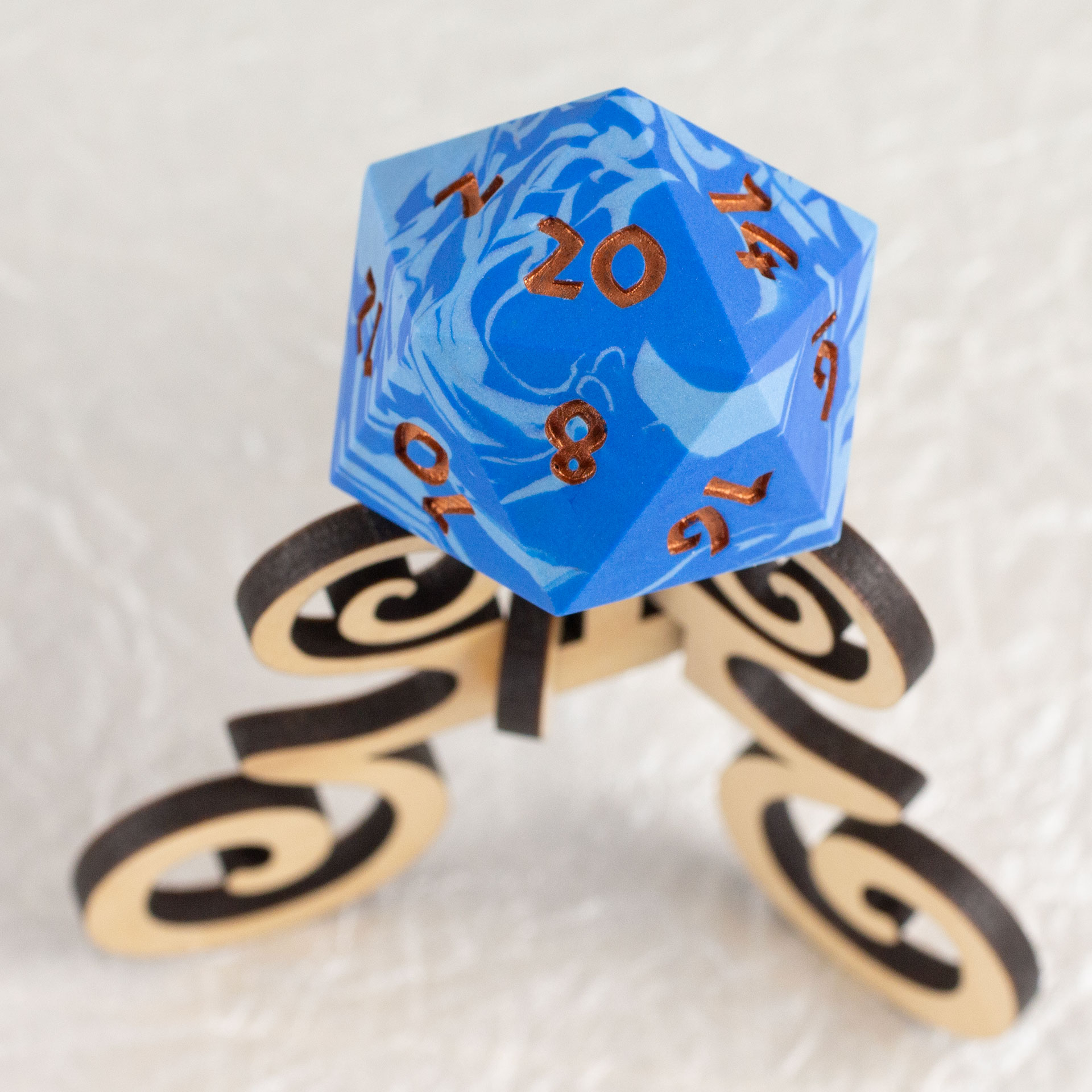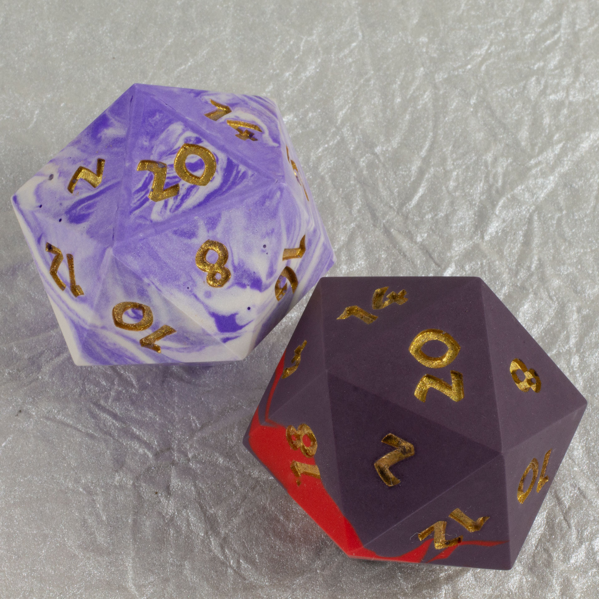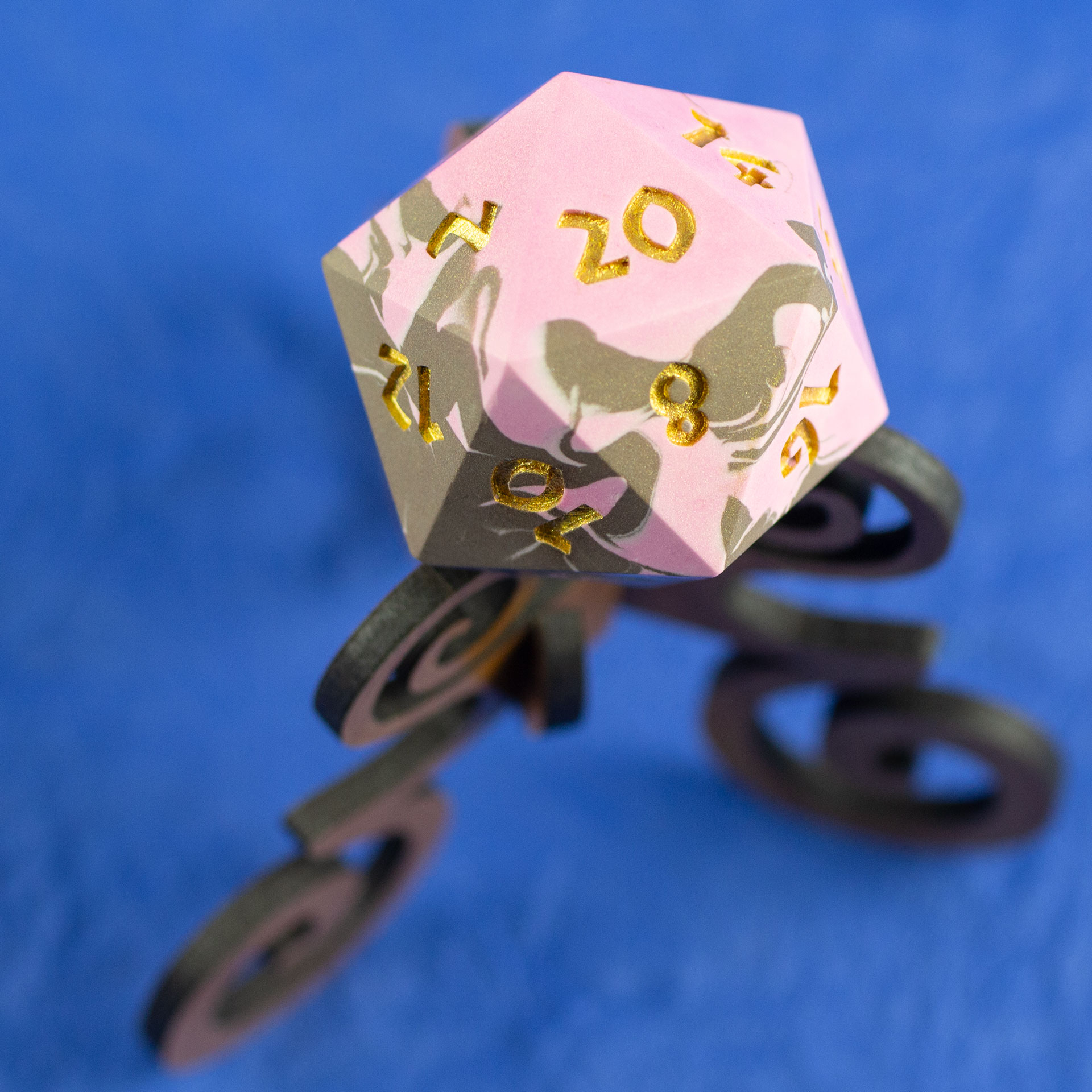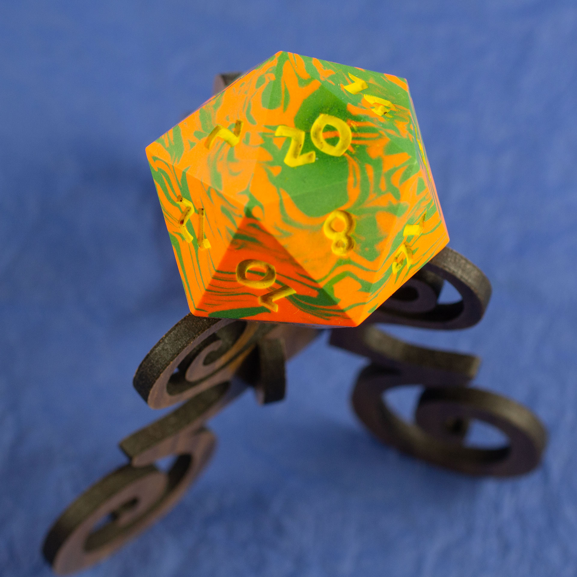 Back in March, I started working on making a big 42mm 20-sided die (a D20, in TTRPG parlance). I modeled it in Blender with a font I like (and have properly licensed), and set about 3D printing one from which to make molds. Although I have been knocking out all sorts of perfect models on my resin printer, there were some issues with getting my Anycubic machine to produce a flawless D20. At first, it was mechanical. It took me a bit to realize the plate had worked itself loose in a way apparently isn’t expected, then a bit to get it fixed correctly. Minor issues after that were eventually resolved by choosing the right resin.