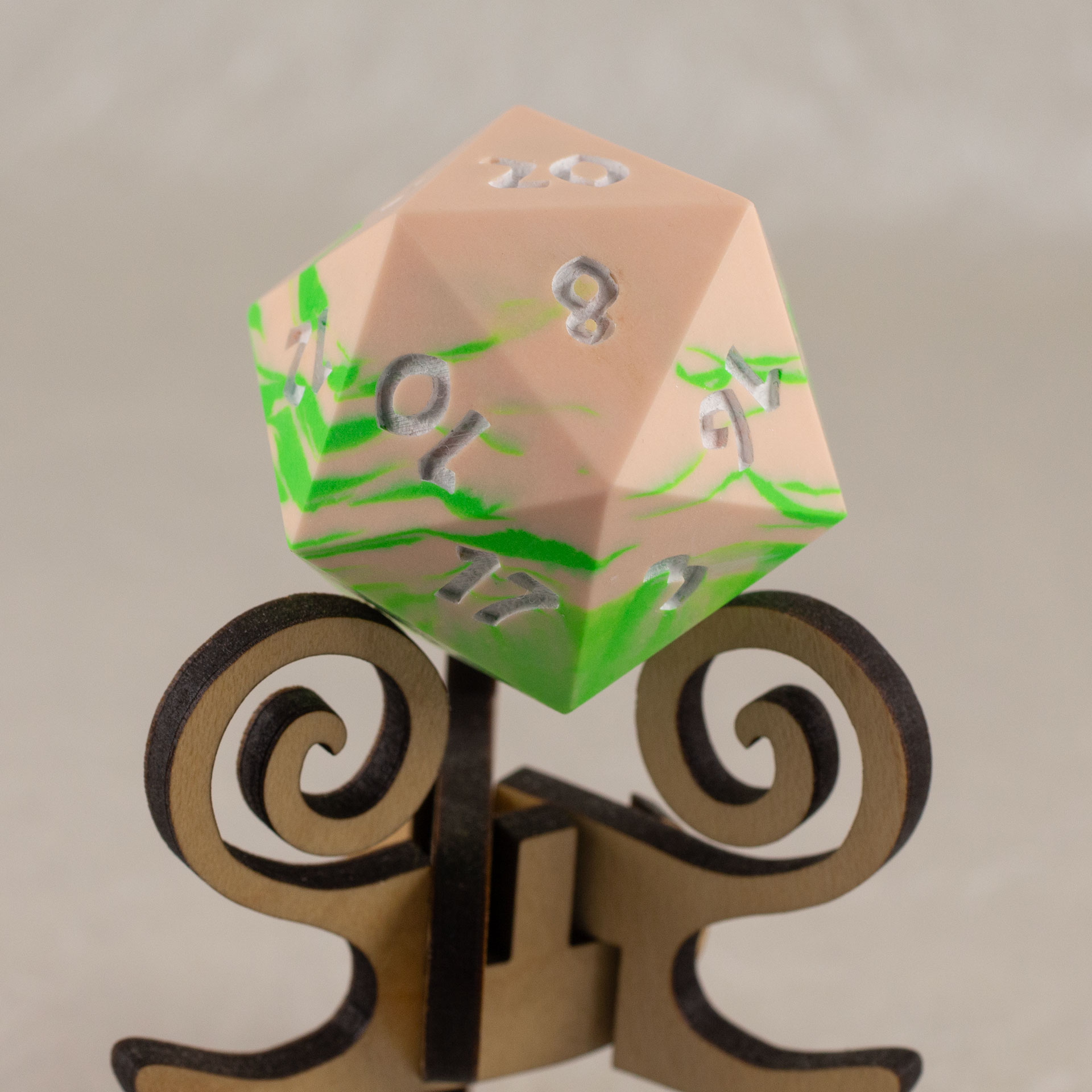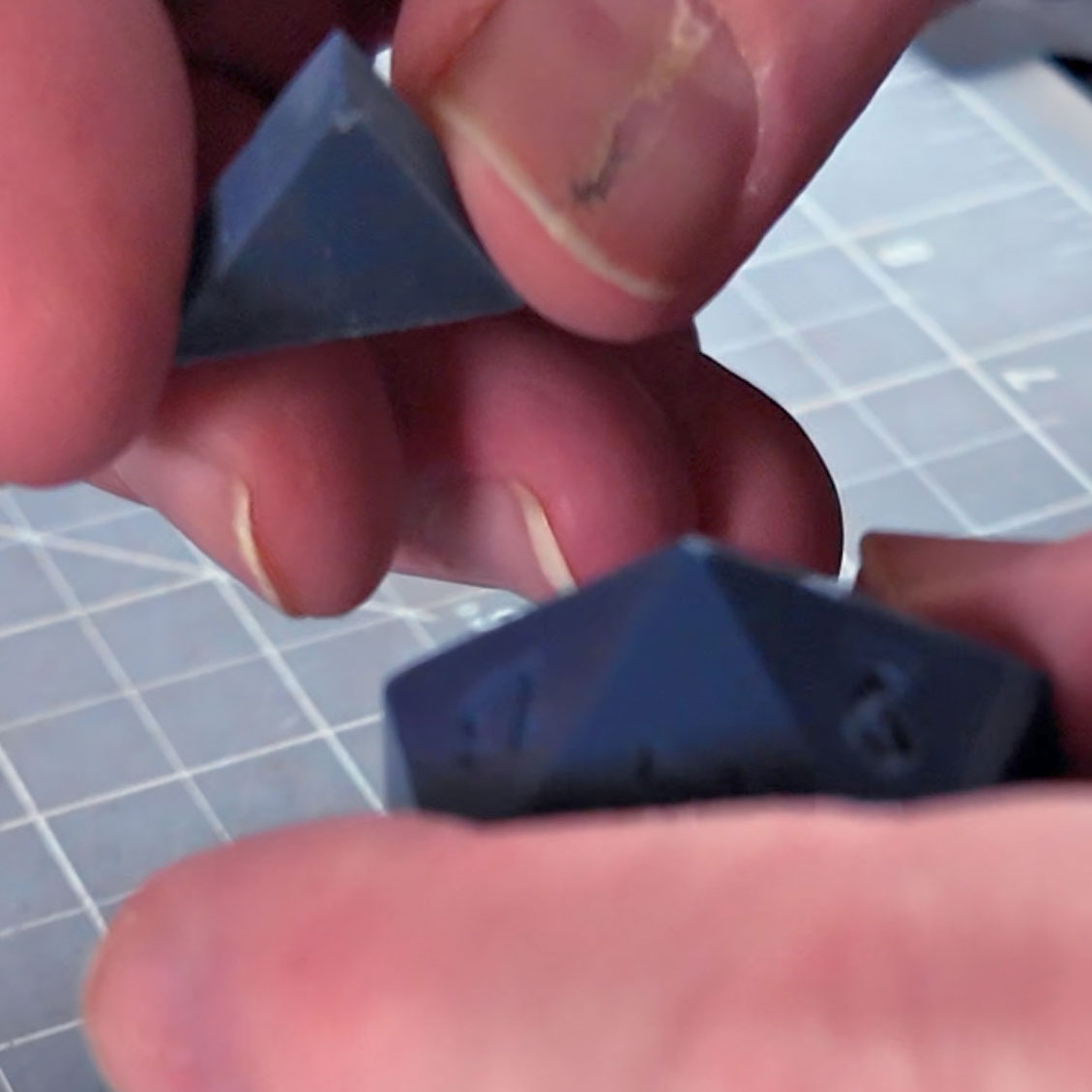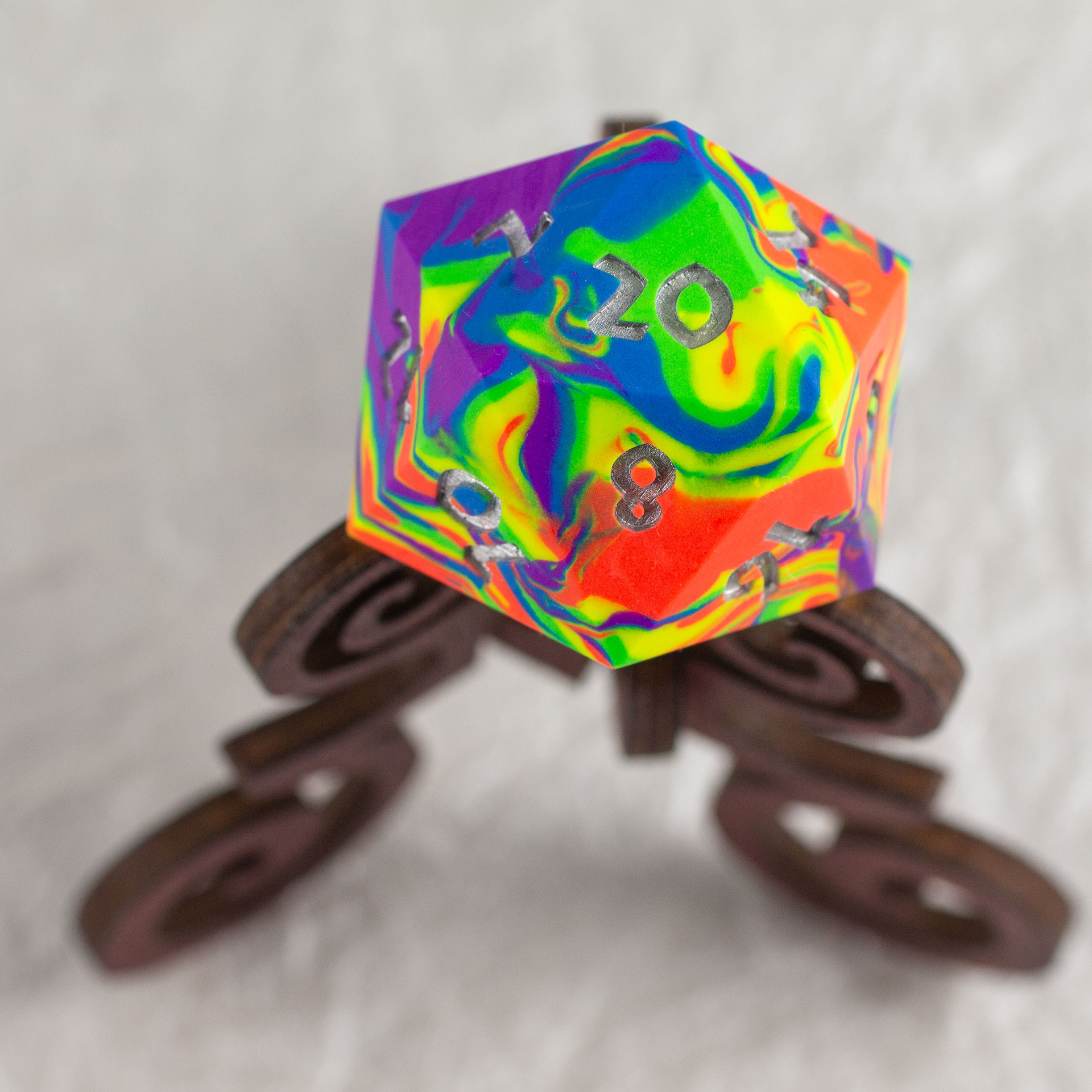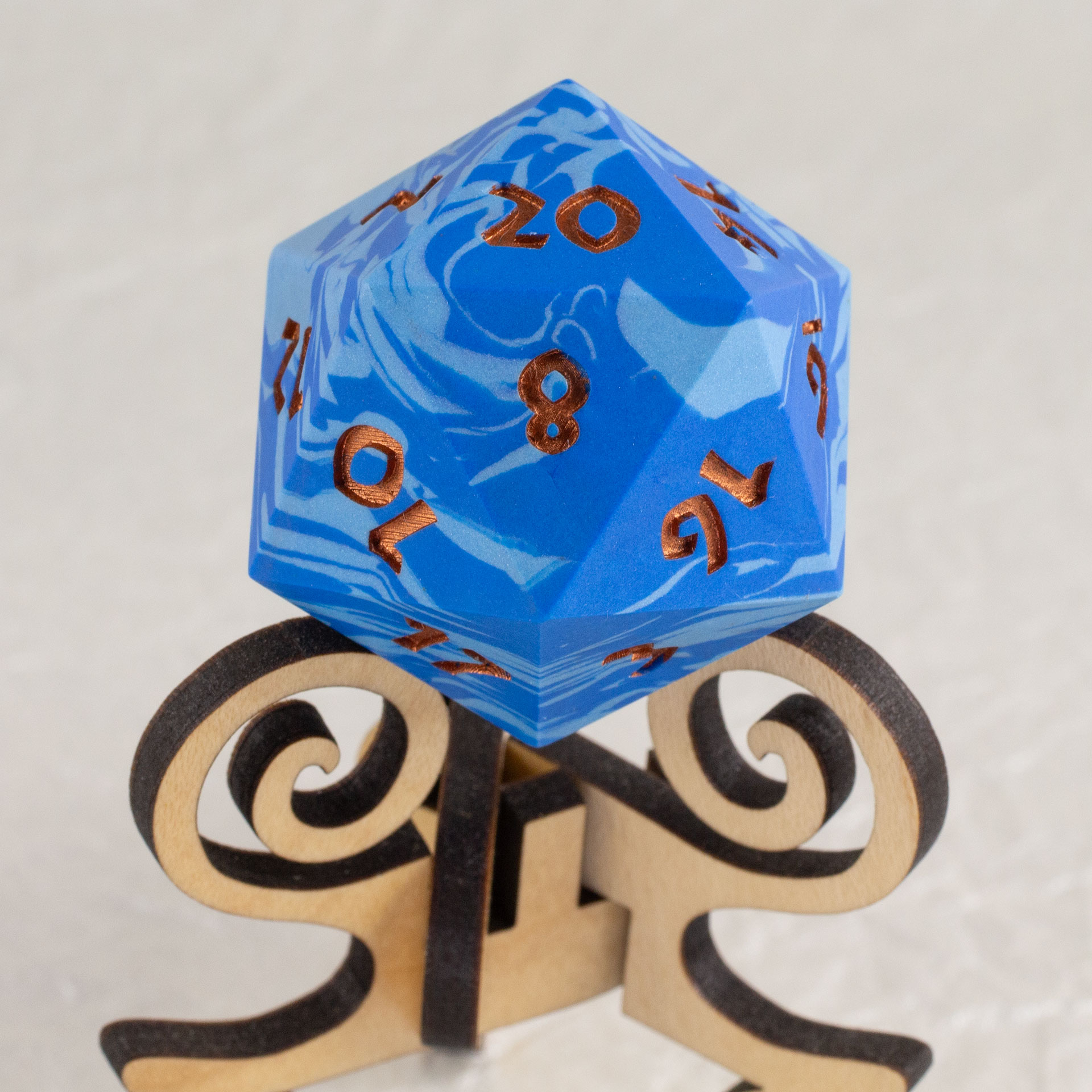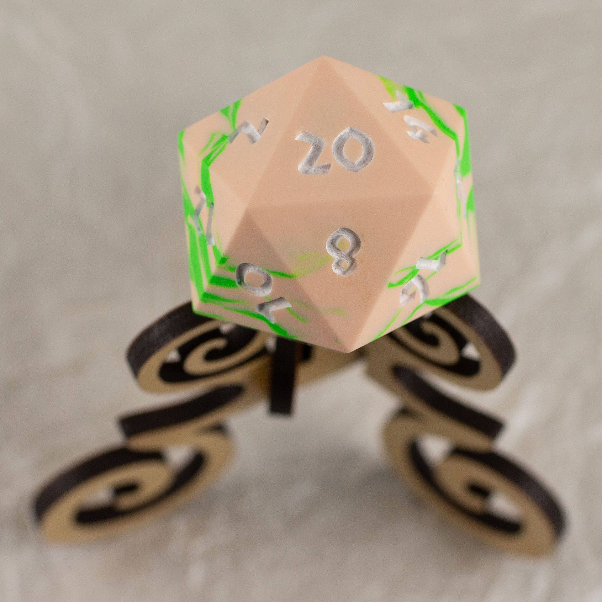 Back in March, I started working on making a big 42mm 20-sided die (a D20, in TTRPG parlance). I modeled it in Blender with a font I like (and have properly licensed), and set about 3D printing one from which to make molds. Although I have been knocking out all sorts of perfect models on my resin printer, there were some issues with getting my Anycubic machine to produce a flawless D20. At first, it was mechanical. It took me a bit to realize the plate had worked itself loose in a way apparently isn’t expected, then a bit to get it fixed correctly. Minor issues after that were eventually resolved by choosing the right resin.
