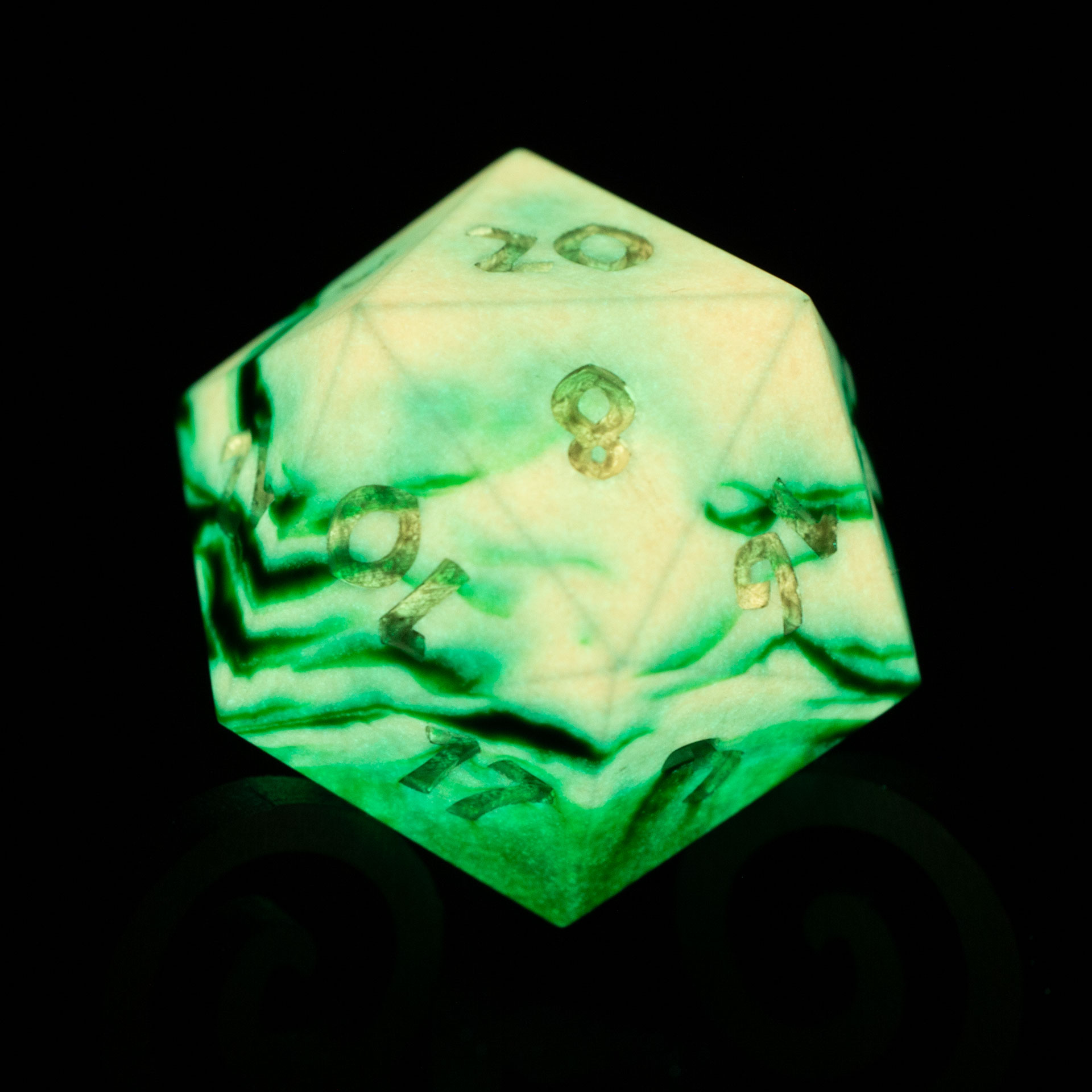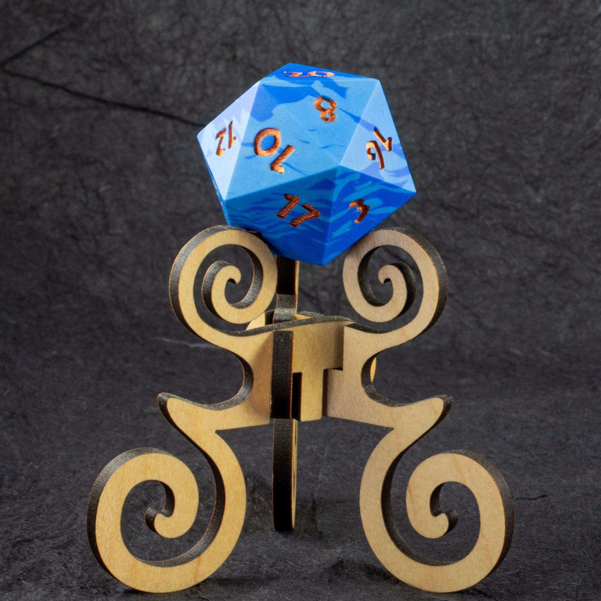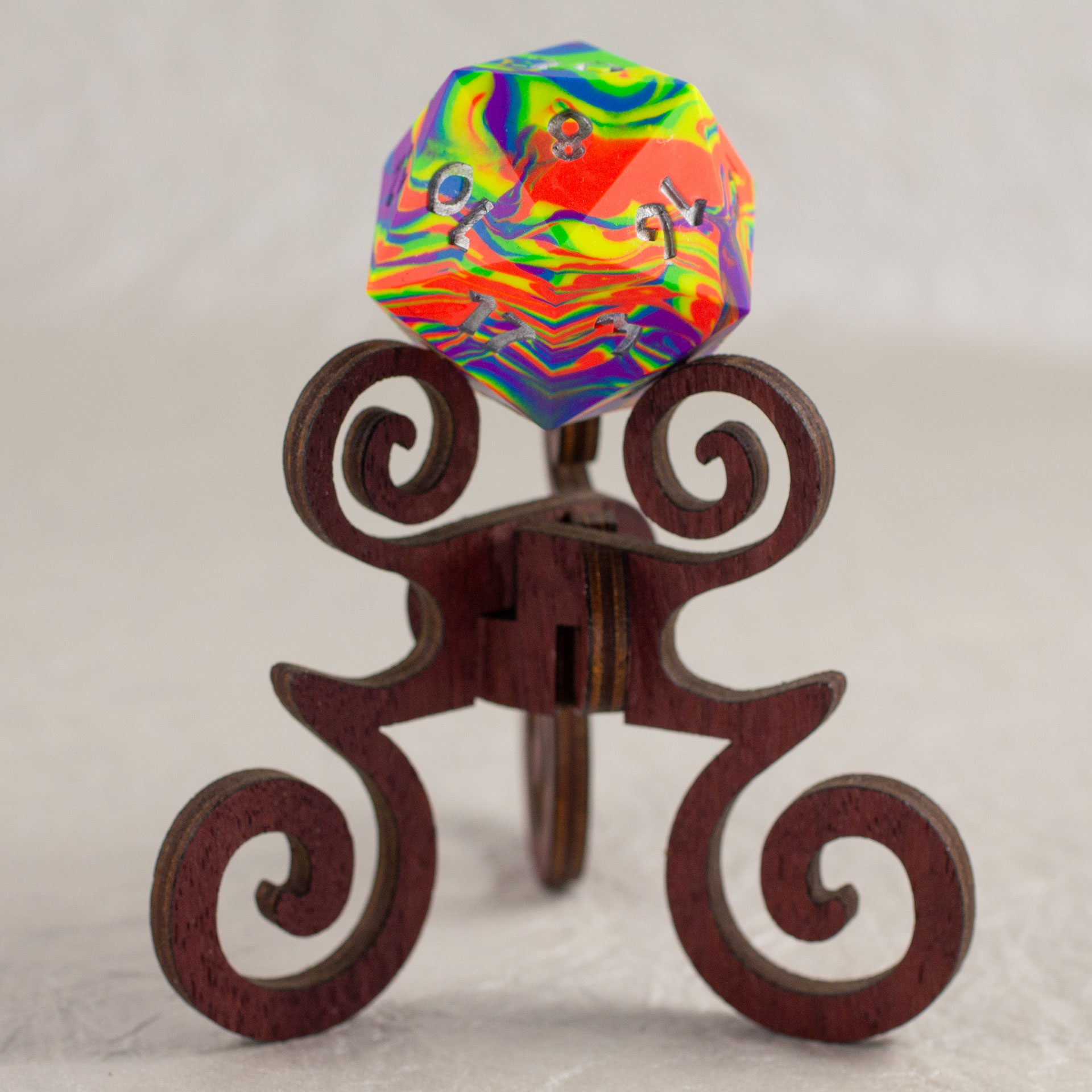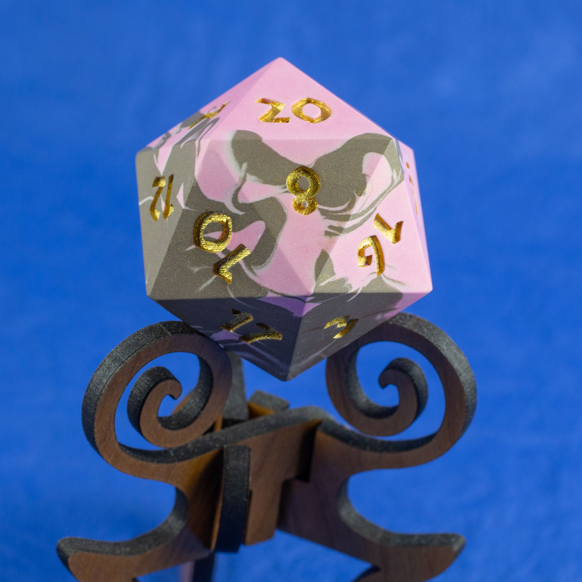 Back in March, I started working on making a big 42mm 20-sided die (a D20, in TTRPG parlance). I modeled it in Blender with a font I like (and have properly licensed), and set about 3D printing one from which to make molds. Although I have been knocking out all sorts of perfect models on my resin printer, there were some issues with getting my Anycubic machine to produce a flawless D20. At first, it was mechanical. It took me a bit to realize the plate had worked itself loose in a way apparently isn’t expected, then a bit to get it fixed correctly. Minor issues after that were eventually resolved by choosing the right resin.