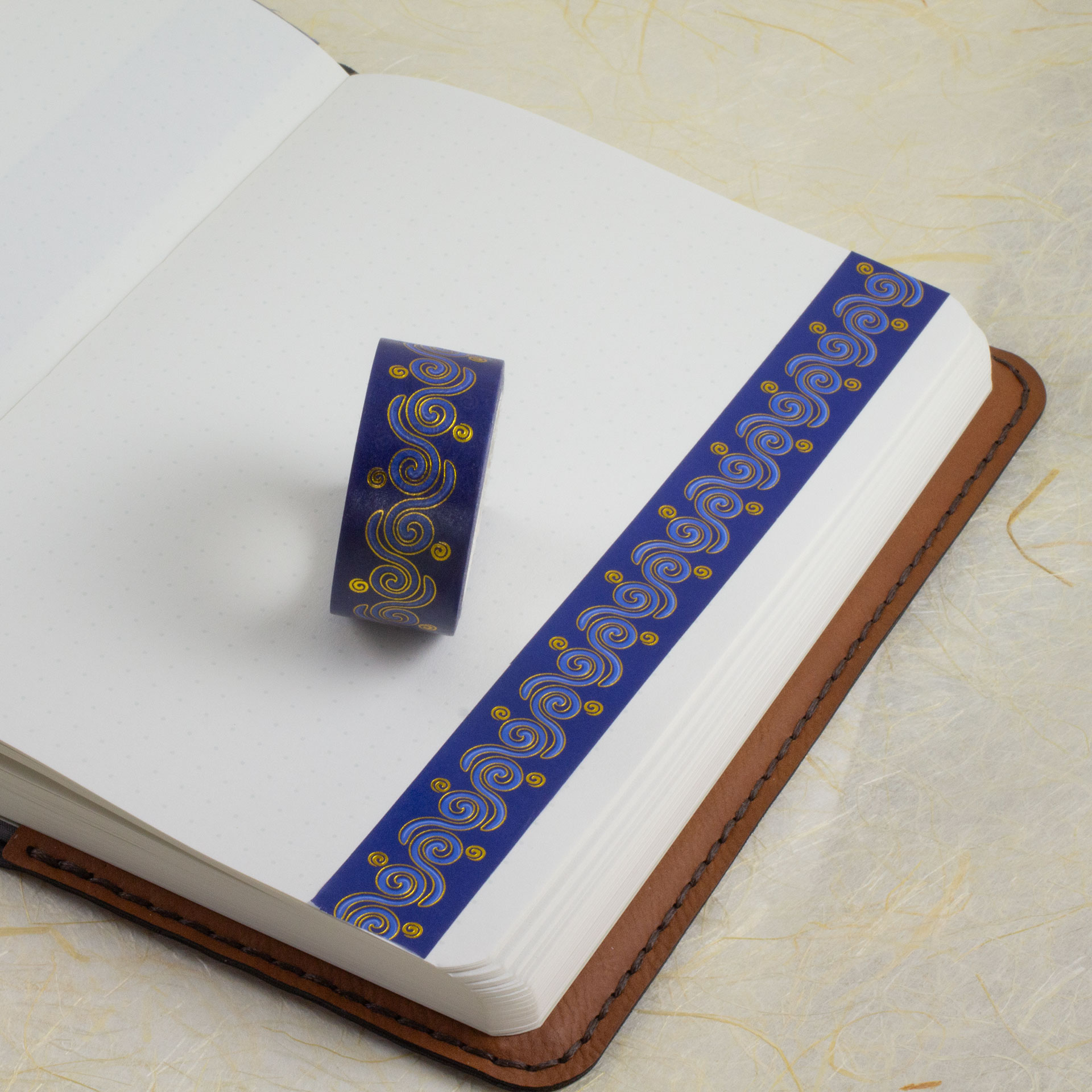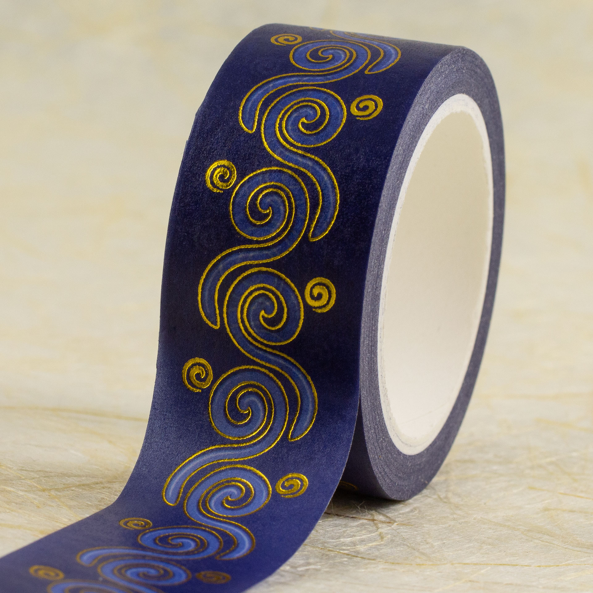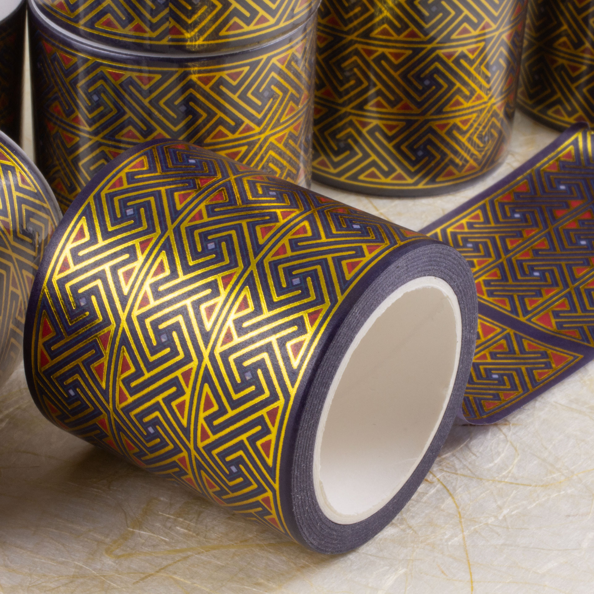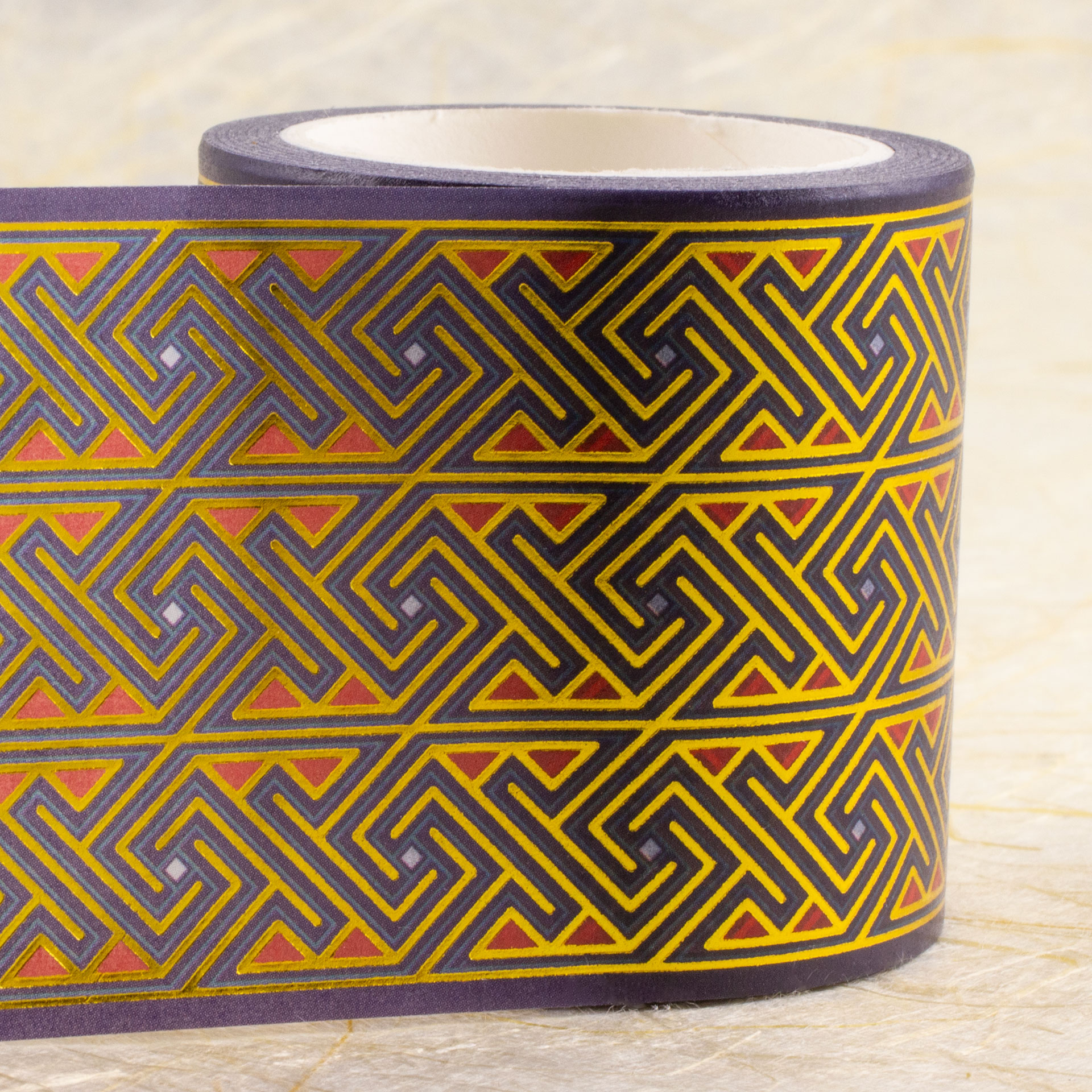 I couldn’t resist designing some more Celtic art washi tape. I did another key pattern, much wider this time (45mm), in purple and red (with some pale blue accents). I made a variant of my Spirals design (similar to the Spiral Flow fabric I did) in shades of blue. I also did a riff on a classic Celtic knotwork/interlacing design in shades of purple (with a green accent). All have gold foil outlines and accents.