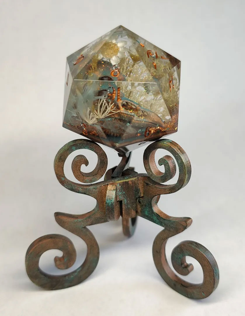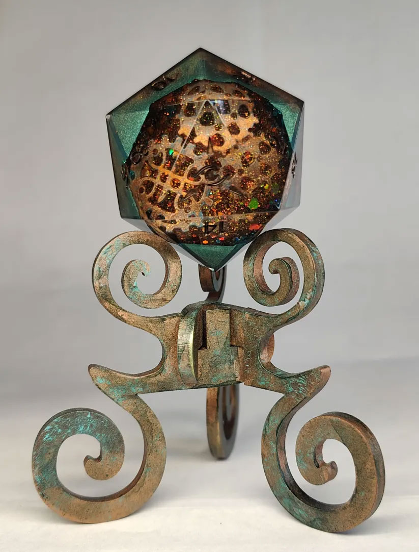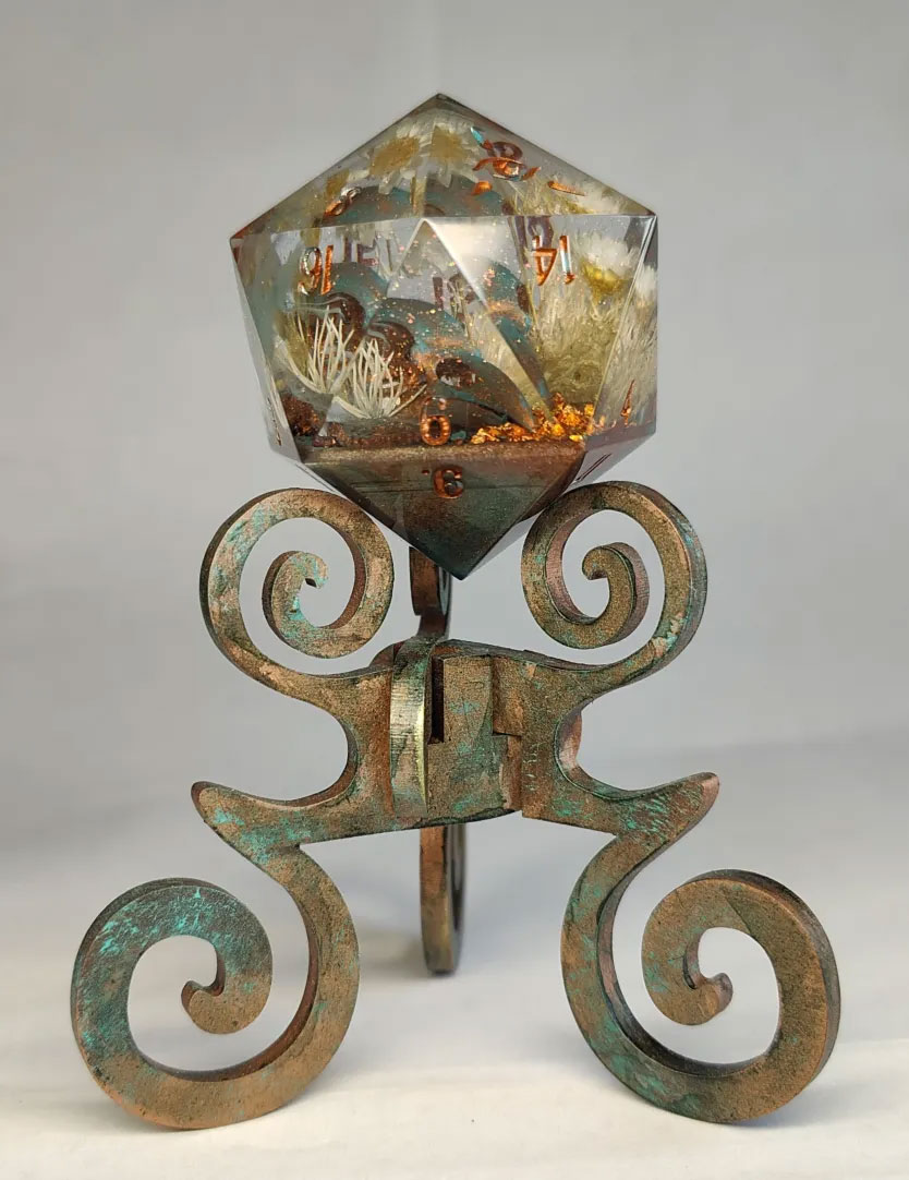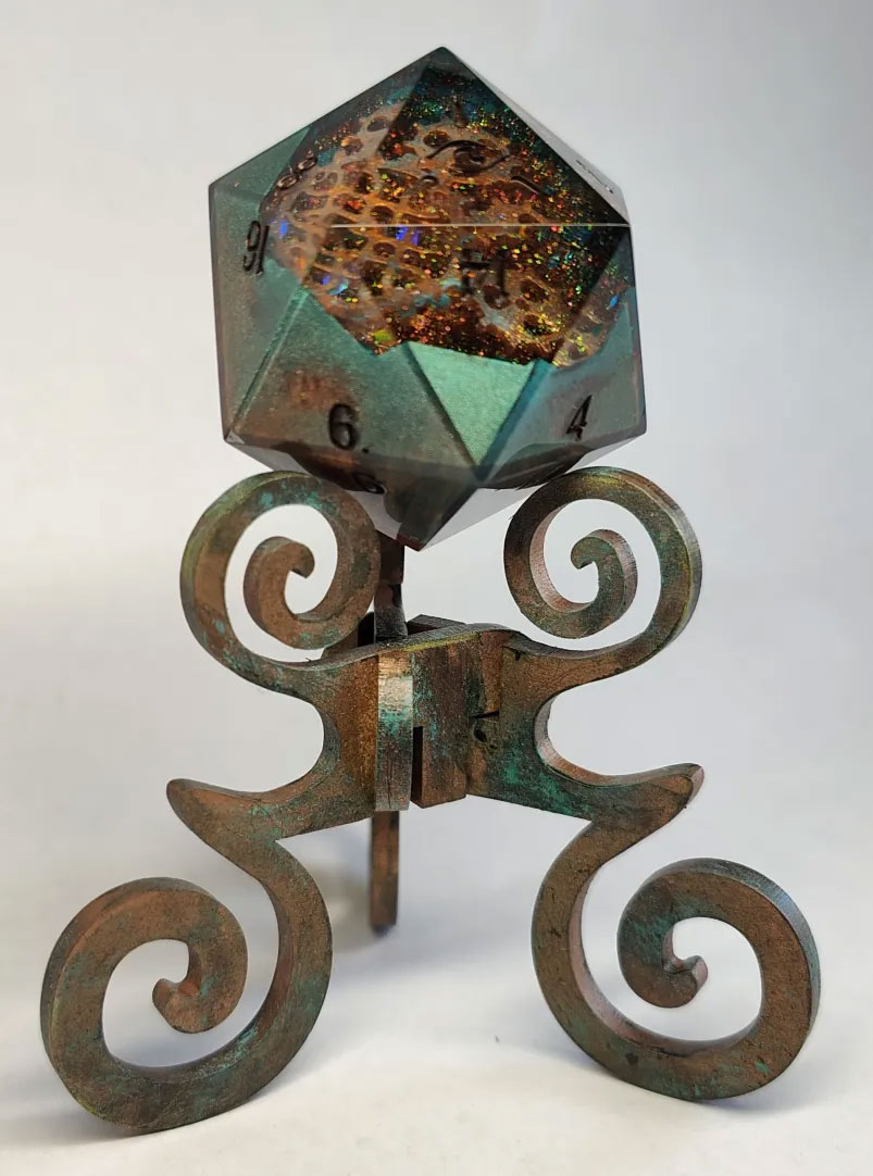 Chatting with resin/dice artist Georgina (@DiceOfTheSeeker) about colors in one of her pieces, I realized it would probably look pretty cool on one of my reliquaries with a copper patina finish. So, I made one and, sent it to her. She sent back some wonderful photos. I also made a 90-second short about how I did the finish.