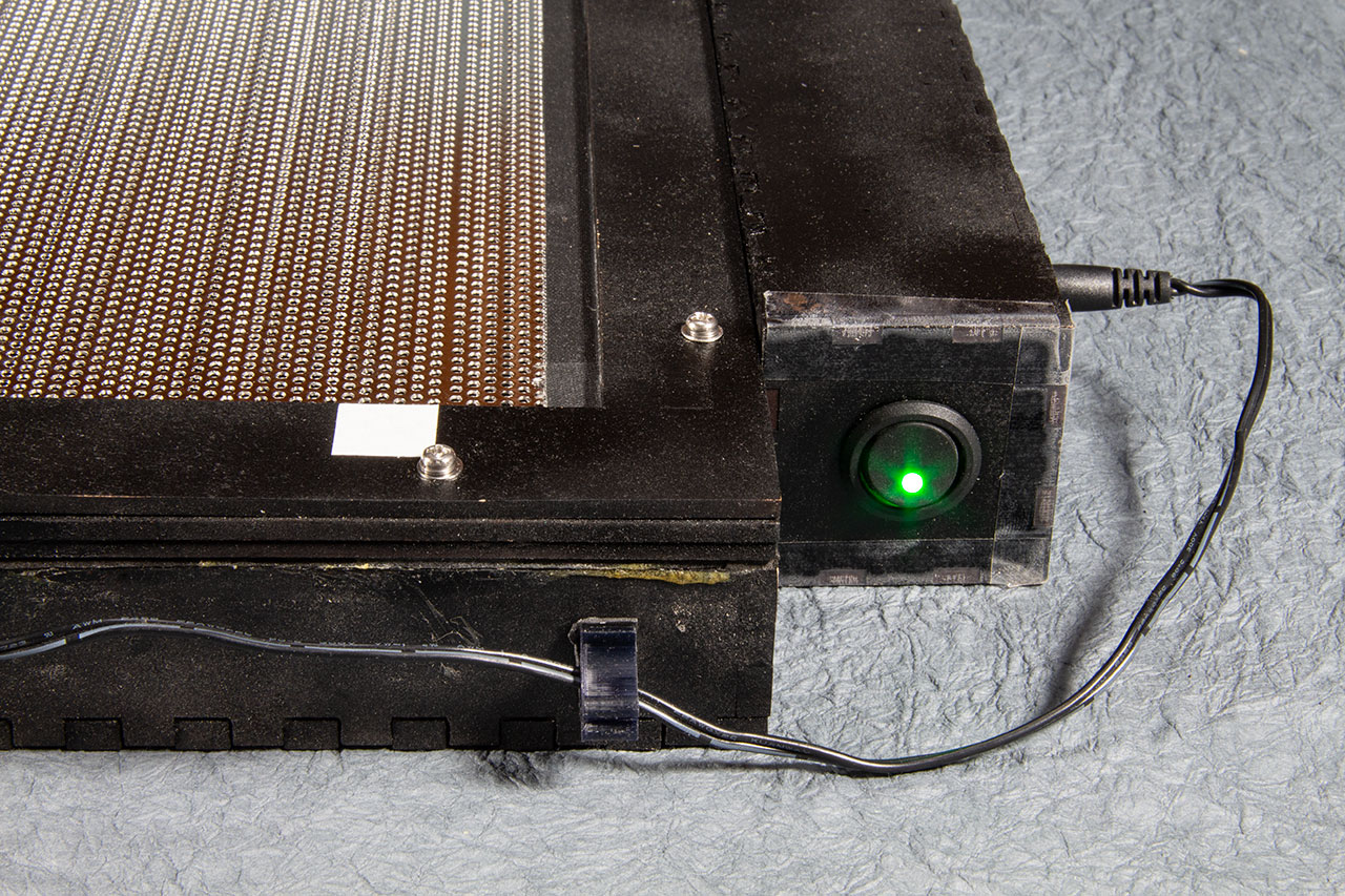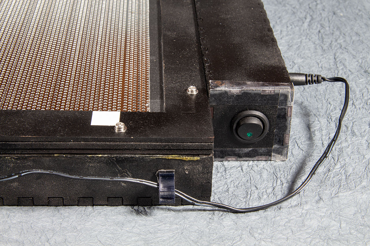 The fan box is 1/8” thick MDF with press-fit holes for the power connector and switch. The fan is bolted on to the end opposite the switch. This uses a 12v fan and a standard 12v power supply. The cord hangs out through the front of the lid of the machine.