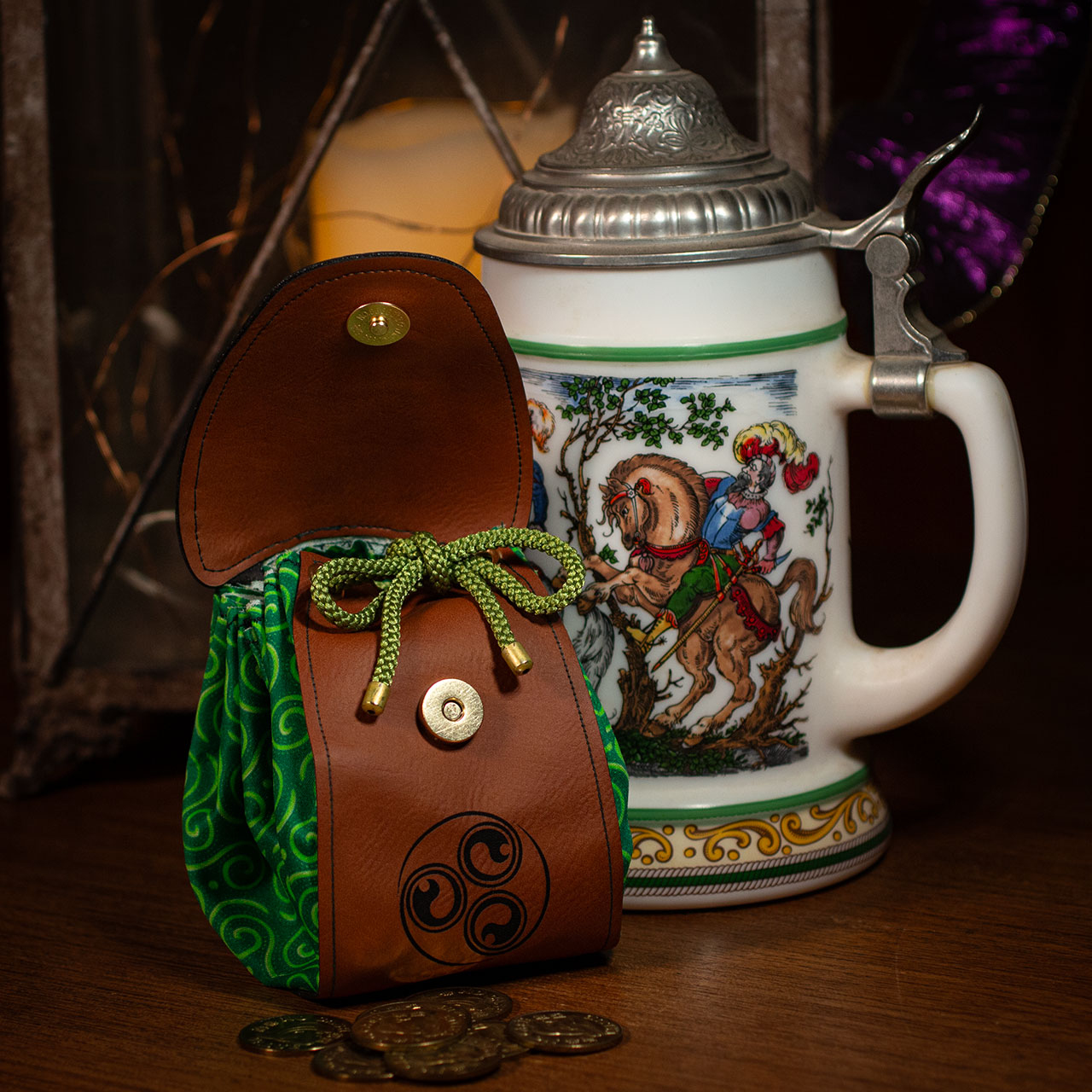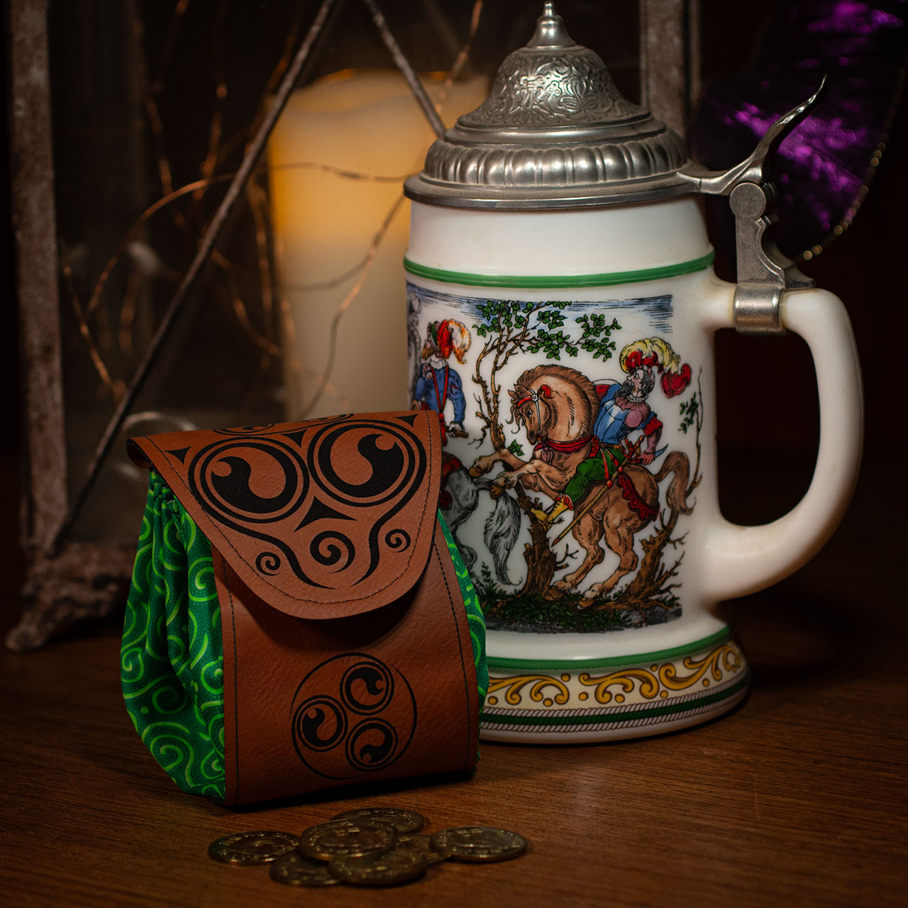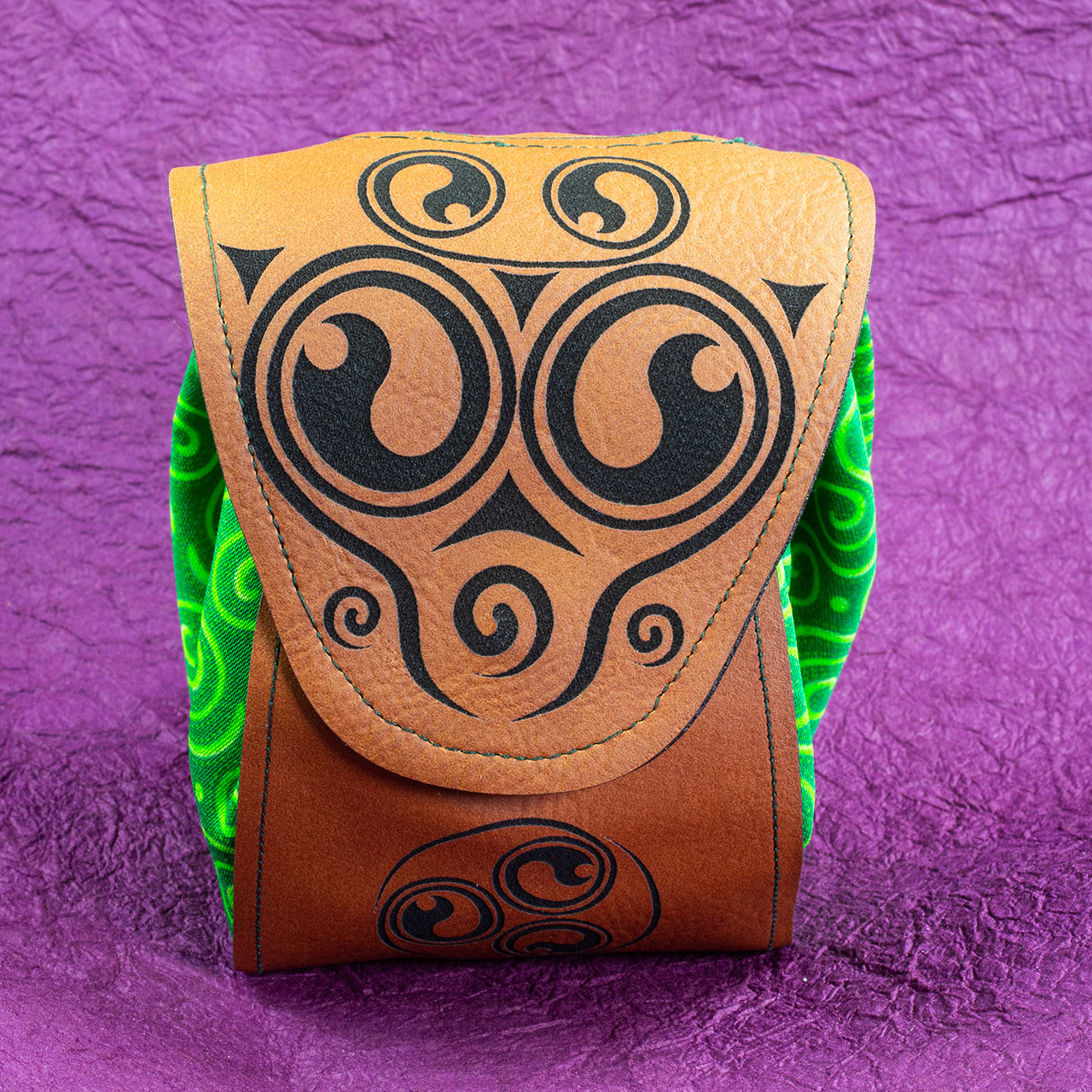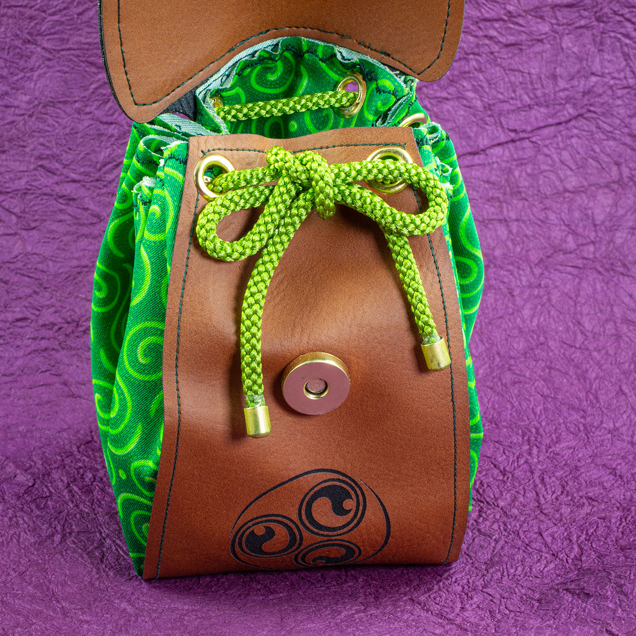 I made this small dice pouch prototype using fabric I had printed with a variant of one of my Celtic spirals designs. The rest of the body is made from a faux/vegan leather. I used my Celtic spirals triskelion and some new derivatives for the front and flap. The drawstring is a commercial braided kumihimo cord and, the front flap has a magnetic clasp.