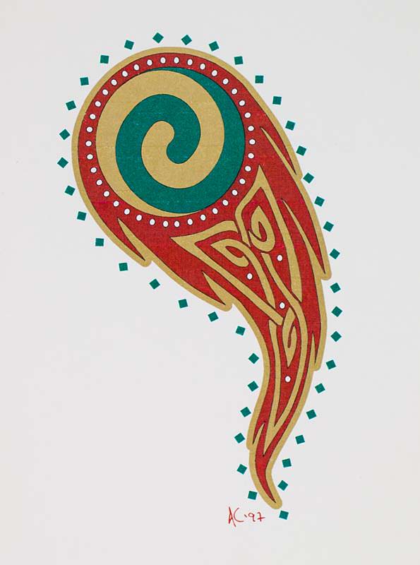 Original Celtic knotwork comet design inspired by the 1997 visit of the Hale-Bopp comet. Fargo Primera print on white stock. 1997