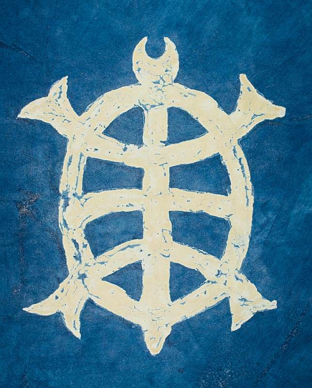 Japanese Turtle Paste Resist Dyed Kozo PaperThis stylized turtle from Japanese heraldry was made by screen printing a flour resist paste onto Japanese kozo bark paper, applying dye thickened with carrageenen, then washing off the paste after setting the dye. This is loosely based on a Japanese textile dying technique called katazome.