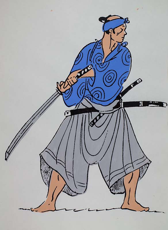 Stylized Japanese samurai taken from unattributed period artwork, 4-color silk screen print with tight registration on paper done on a bespoke single screen/station rig. 9.5" by 8".