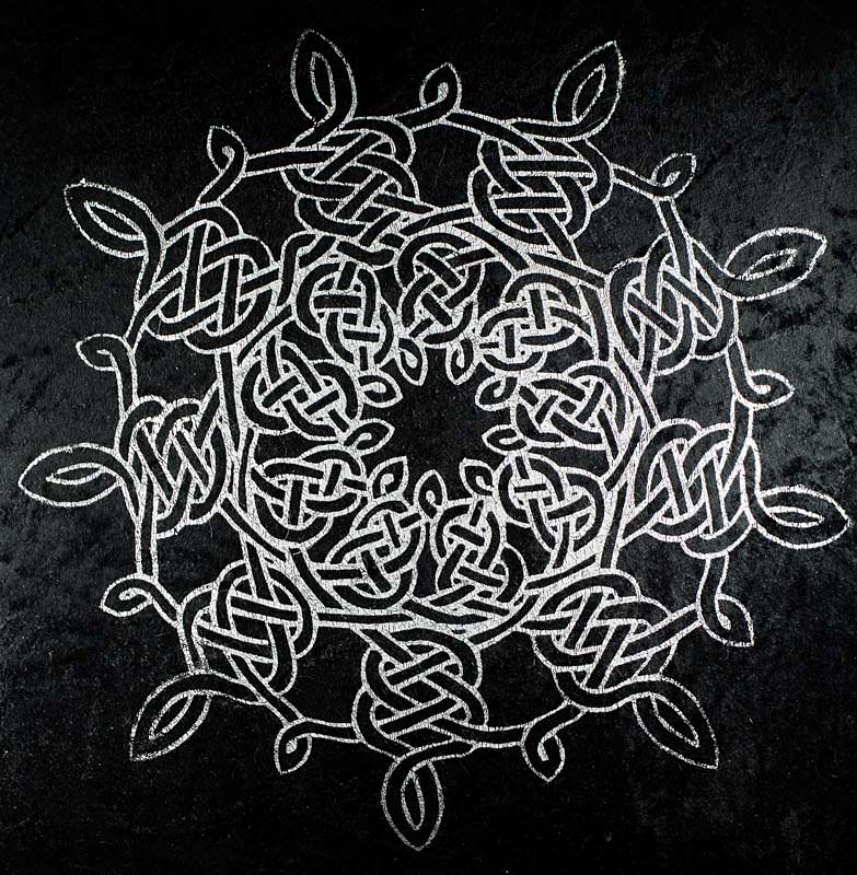 Silver Snowflake original Celtic knotwork design. Photo screen print in metallic silver on Black Velvet. These adorn a matching set of throw pillows. 12.5" by 12.5". c. 1992