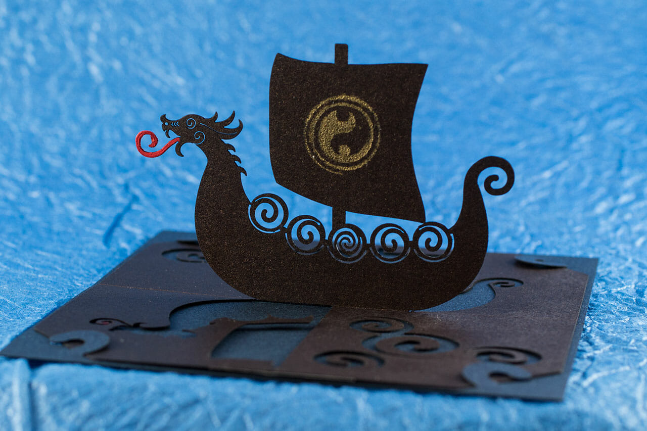 Viking Longship 180-degree open twisted crest origamic architecture/kirigami pop up card by Andrew Crawford.
