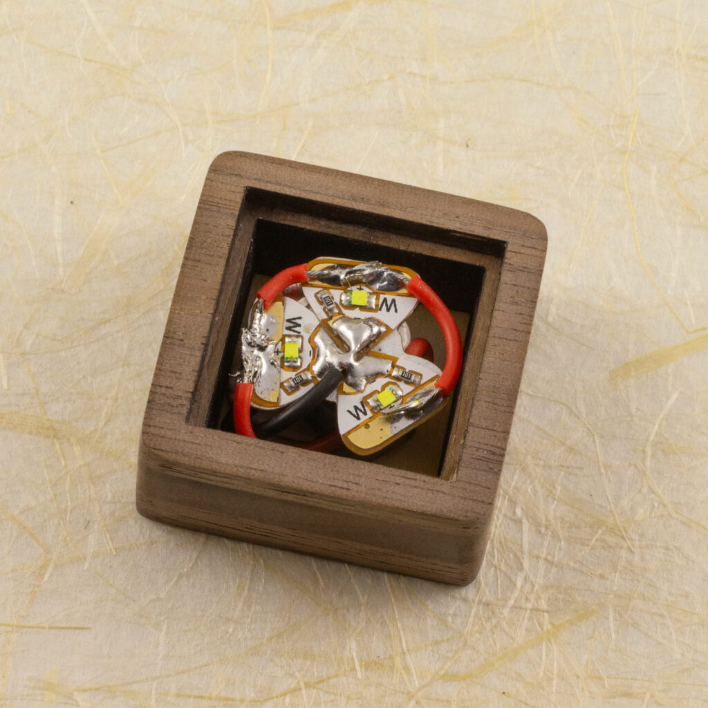 This prototype is the result. The base is several layers of laser-cut walnut, glued together and finished. There is a cavity for the light and a lip that supports a piece of diffuser material and a 1-inch acrylic cube.